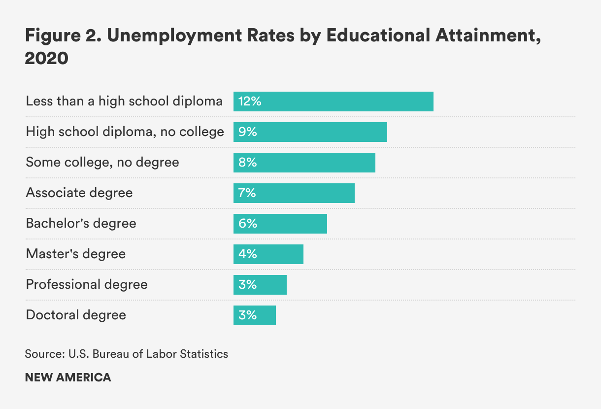 Wage premiums for recent graduates are just one of many economic benefits associated with college completion. Research suggests that in 2018, the median earnings of workers of all ages with bachelor’s degrees were nearly $25,000 higher than those of workers with high school diplomas. This suggests that college wage premiums remain for workers of all ages and do not fade over time. Additionally, college graduates have lower unemployment rates than high school graduates. In January 2022, the unemployment rate for college graduates was half the unemployment rate for high school graduates without college degrees (see figure 2). Taken together, this means that college graduates are more likely to have jobs, and more likely to have higher-incomes, than are people without college degrees.
