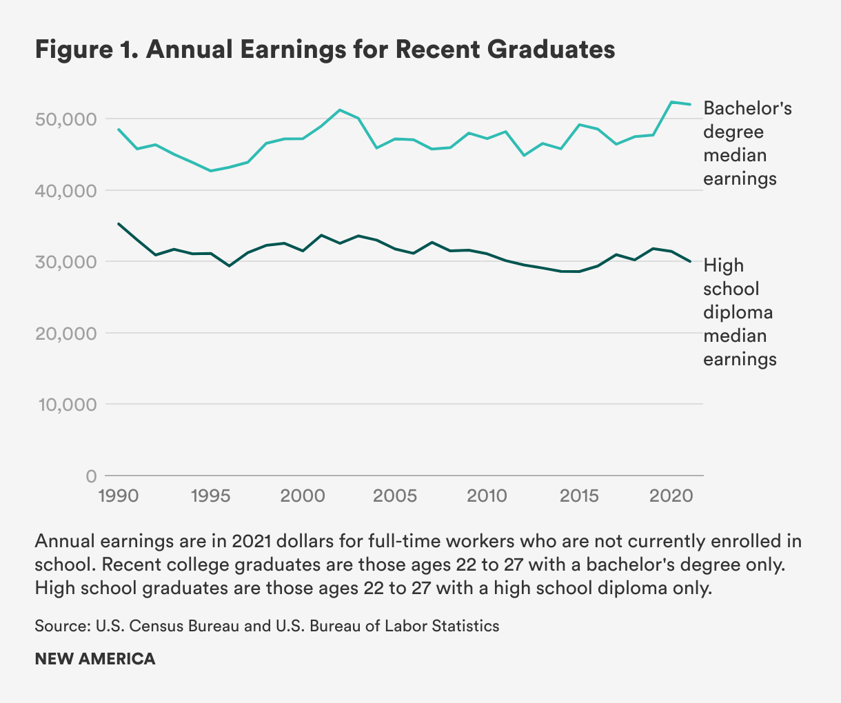 The wage gap between young workers with and without bachelor’s degrees has never been larger. On average, recent college graduates earn $52,000 per year, while young workers with high school diplomas but no higher education credential earn only $30,000 per year. The difference in wages between college and high school graduates – often referred to as the college wage premium – has increased since the start of the COVID-19 pandemic (see figure 1). This growing source of economic inequality is particularly troubling given that college enrollment has also declined by more than 1 million students since the onset of COVID-19. If these trends continue, they could exacerbate economic inequality for years to come.
