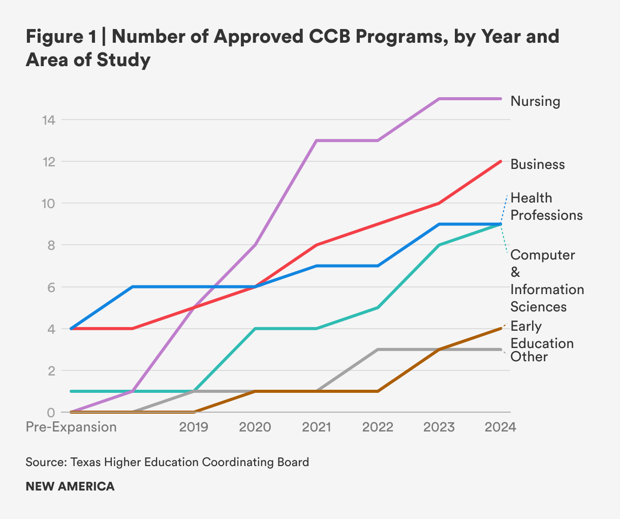 Texas’s CCB experience began over 20 years ago. In 2003, state legislation authorized three community colleges to pilot up to three baccalaureate programs each. During the pilot phase, a total of nine programs were developed at the three institutions and a fourth college was permitted to join them in the mid-2010s. In 2017, the CCB pilot status was lifted and bachelor’s program authorization was expanded. Since then, as Figure 1 below shows, Texas community colleges have quickly adopted the CCB. Nursing programs have embraced the change especially quickly.
