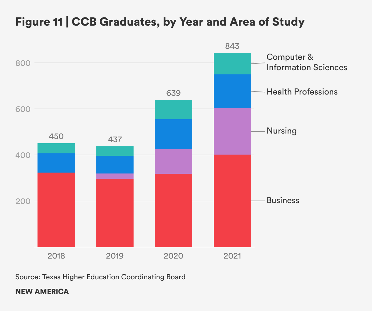 In total, 843 Texans earned a bachelor’s degree from a community college in 2021, the most recent year of our data. In each year of our data, the majority of students graduating from CCB programs in Texas obtained a degree in business. As with enrollment, much of this figure is thanks to the expansive business program offered at South Texas College. However, the number of graduates in health professions and nursing grew more than business, though computer and information sciences programs did also have a jump in the number of graduates in 2020 and 2021 compared to the two previous years.