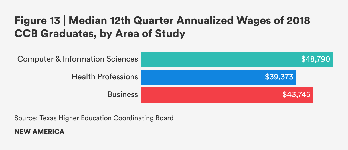 While problematic gaps exist, graduates of CCB programs do appear to be earning wages that are similar to all Texas baccalaureate graduates. The Georgetown University Center on Education and the Workforce defines a “good job” as one that earned at least $38,000 for workers under age 45 in 2020.[7] For comparison, the median wage in 2021 for workers in all occupations in the state of Texas, regardless of educational attainment, was $39,030.[8] Our sample is different, as the students are three years post-graduation, but at a median wage of $44,102, they do not appear to be valued less than all graduates in the labor market. This suggests an important signal of the quality and demand that employers place on CCB graduates. Taking into account that these earnings reflect both full-time and part-time employment, the returns on CCB degrees appear impressive.