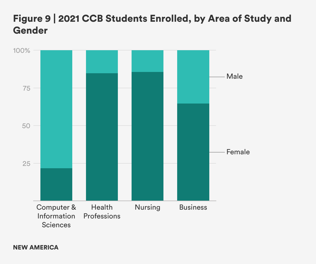 Figure 6 depicts the number of CCB students enrolled in key areas of study, covering almost all CCB programs in the state. Enrollment in business programs represented the largest group across all four years of our data. However, other areas of study saw greater increases in enrollment, due to the introduction of additional health professions programs, particularly the launch of nursing programs in 2019. Enrollment in computer and information science programs remained relatively stable from 2018 to 2021, though students in these programs represented a declining share of the whole as enrollment in health programs grew. The next three figures represent a snapshot of the demographics of students enrolled in CCB programs and their area of study in 2021.