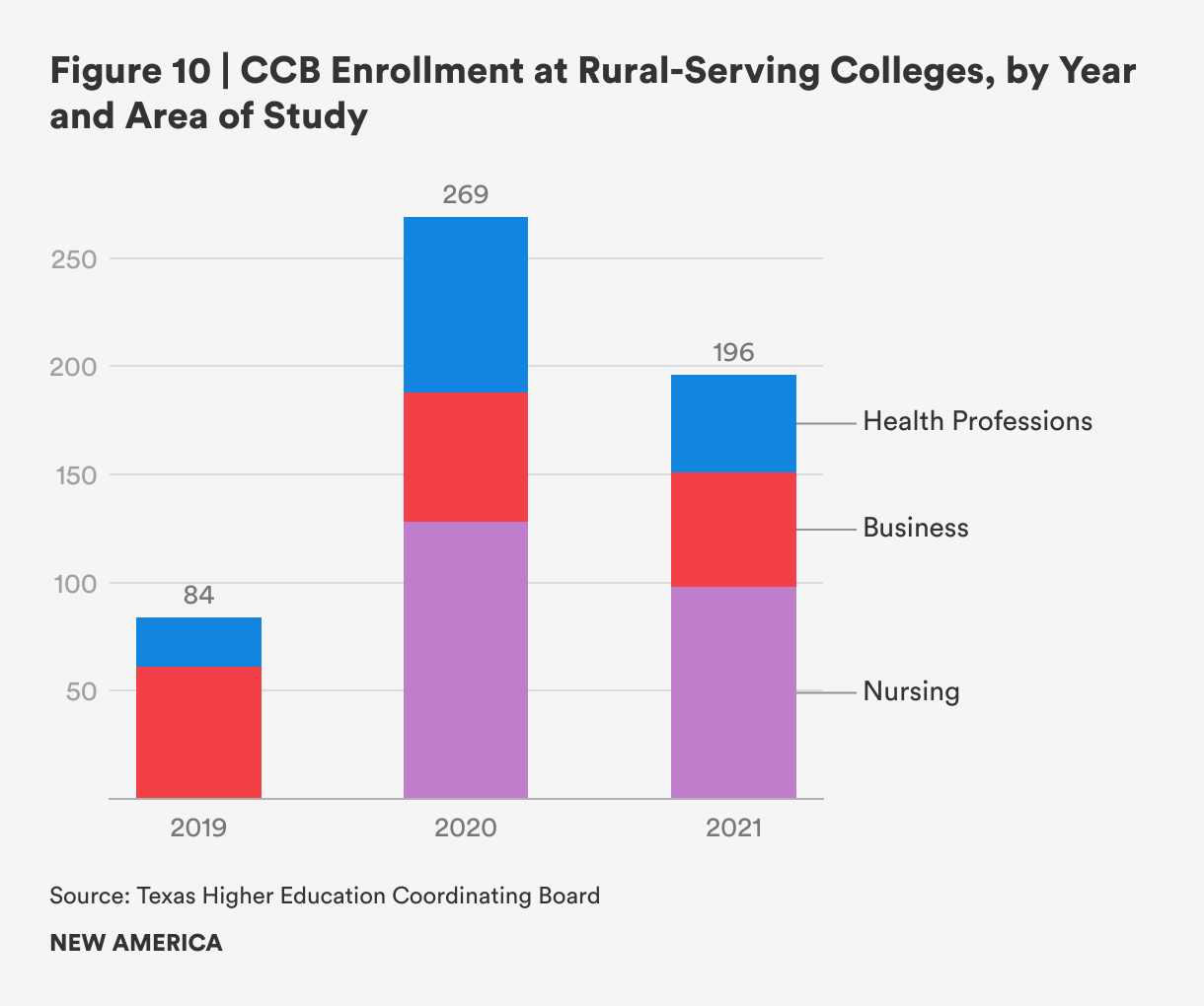 CCB degrees have the potential to offer bachelor’s degrees to students who may want or need to stay close to home while earning a bachelor’s degree, while also addressing local workforce needs. However, rural colleges tend to have smaller enrollment and fewer programs than in urban areas. In 2021, only three community colleges in Texas that were considered rural-serving were enrolling CCB students, with a total of 196 students enrolled in four programs, which was only 8 percent of total CCB enrollment. Half of all CCB students enrolled in rural-serving colleges were in nursing programs, and an additional 23 percent were enrolled in other health professions. The 98 students enrolled in nursing at rural-serving colleges represent 32 percent of all nursing CCB students in Texas in 2021. Rural students enrolled in business programs represent less than 1 percent of all students enrolled in CCB business programs in the state. Note that all three rural-serving institutions offer degrees in applied health professions, which are most often health management programs, and only one rural-serving community college offers a CCB in business. None of the rural-serving schools offer a CCB program in engineering. CCB stakeholders often point out that the programs offered are often developed in response to local labor market needs, particularly in rural areas.