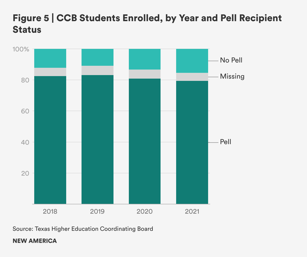 In 2021, 79 percent of Texas CCB students had received a Pell Grant at some point during their college education, compared to 32 percent of undergraduates nationwide, suggesting that CCB programs are providing an important access point to bachelor’s programs for low-income Texans (Figure 5).
