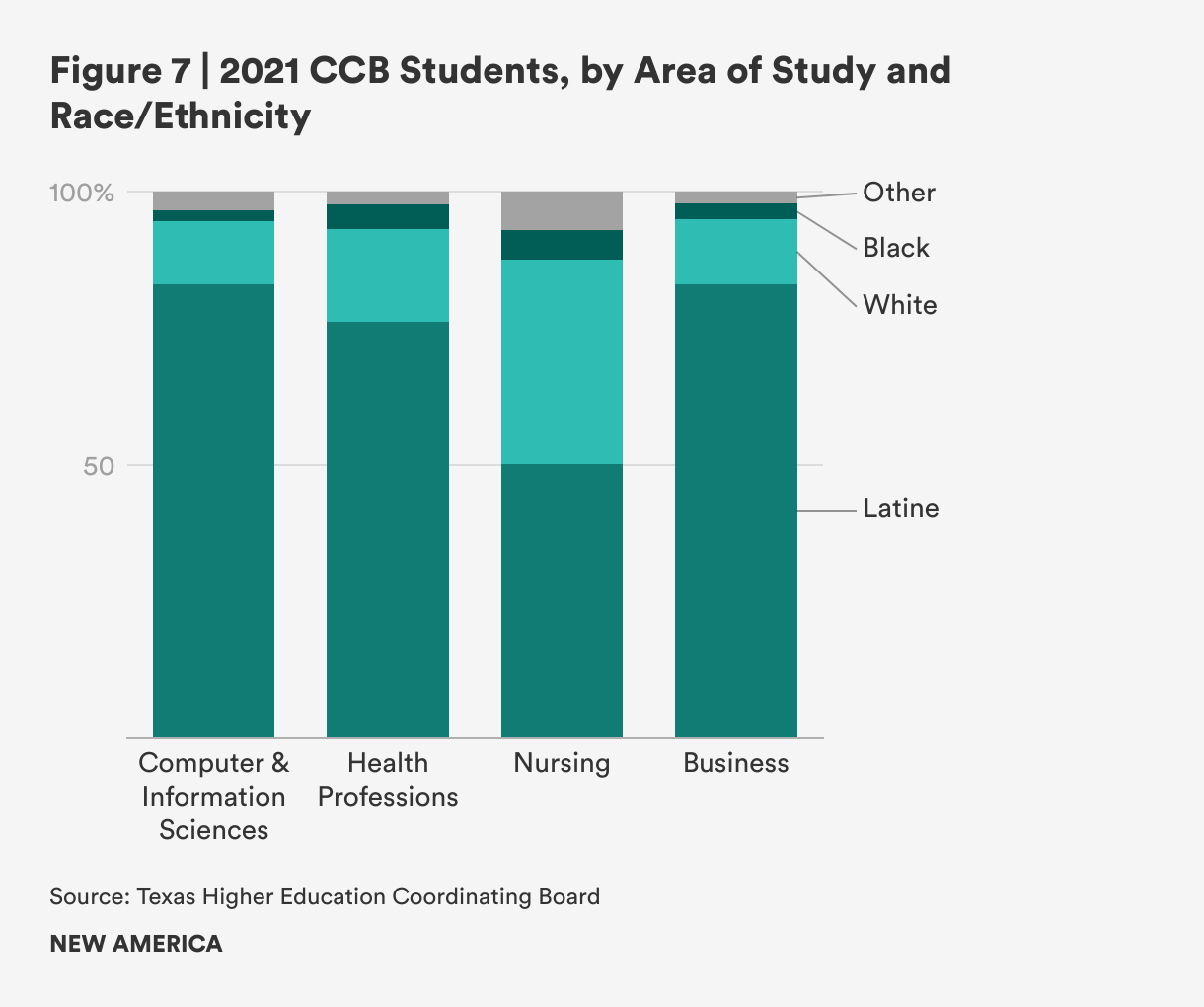 In 2021, Latine students made up the majority of those enrolled in CCB programs in all fields of study with sufficient data for analysis. However, Latine students are underrepresented in health professions, specifically nursing (compared to the overall CCB student population at 78 percent, as shown in Figure 2). White CCB students are overrepresented in nursing, at 37 percent compared to 16 percent of total white students enrolled in all CCB programs in 2021. Approximately 56 percent of all enrolled Latine students are pursuing business degrees, and only 27 percent are enrolled in health professions, including nursing. By comparison, 39 percent of white students are pursuing degrees in business and 49 percent in health care professions.