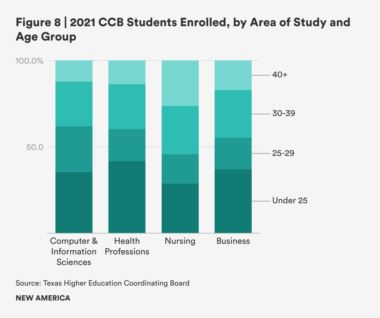 We address these research questions using aggregate CCB enrollment and graduate data provided by the Texas Higher Education Coordinating Board (TXHECB) in response to a New America data request. These data include area of study,[2] race/ethnicity, gender, age group, and college, where sample sizes were sufficient to report. Student enrollment data were from 2021, representing the most recent year for which data were available at the time of the request. CCB graduate data spanned from 2018 to 2020. We conducted basic descriptive analyses of these data to reveal trends in student or graduate identities and labor market outcomes. The following sections present our findings and analysis corresponding to our research questions.
