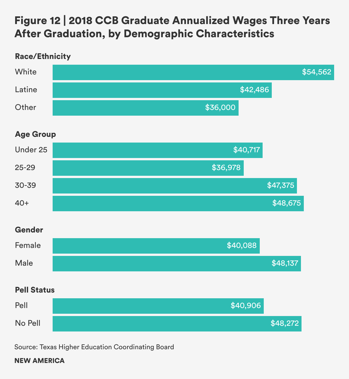 In Texas, substantial wage gaps exist between demographic groups, with students whose race is categorized as “other”[6] experiencing the lowest incomes, closely followed by Latine students. Female graduates earn about $8,000 less than men annually, and the gap is similar for students who received a Pell Grant in college versus those who did not. Unfortunately, there were too few Black graduates with wage information to share; thus, findings for this group were suppressed. Black students and graduates were underrepresented in our data relative to this group’s share of the Texas population.