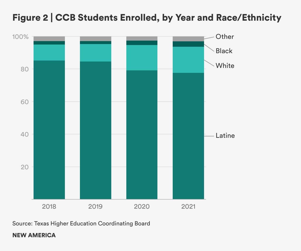 [4] Texas Demographic Characteristics and Trends and Higher Education (San Antonio, TX: Texas Demographic Center, 2021). See slide 33 for a breakdown of education attainment level by race/ethnicity in Texas.