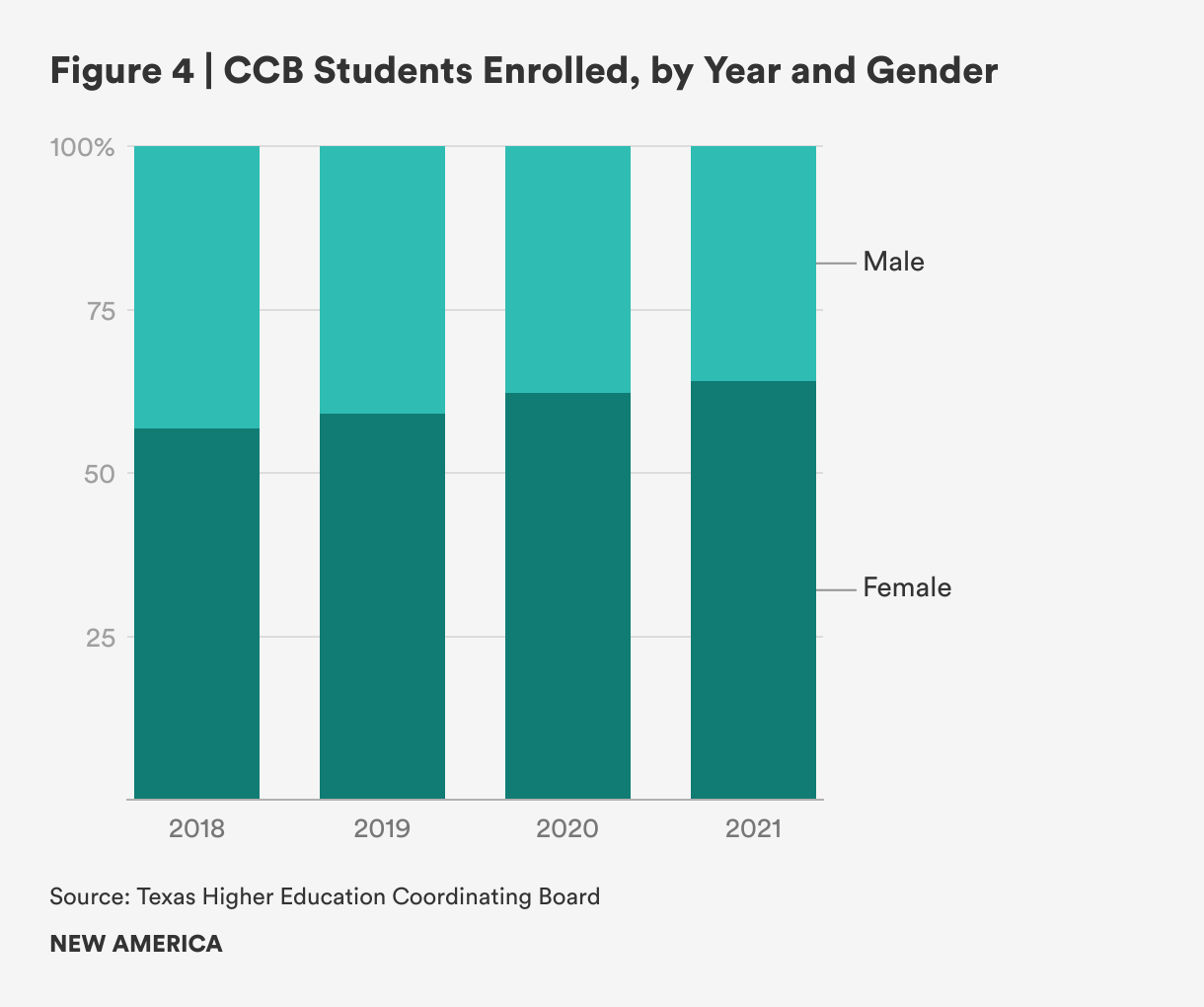 Our analysis revealed a significantly higher percentage of female students than male students in the CCB population (Figure 4). In Texas, women make up nearly two-thirds (64 percent) of CCB students. Nationally, women made up 59 percent of enrollment in community colleges in 2020, a smaller share than what we observed in the Texas CCB data. Since many of these programs are in female-dominated health professions such as nursing, it is perhaps unsurprising that the share of women enrolled in CCB programs in the Lone Star State has grown each year from 2018 to 2021 and that it exceeds women’s overall enrollment in community colleges nationwide.