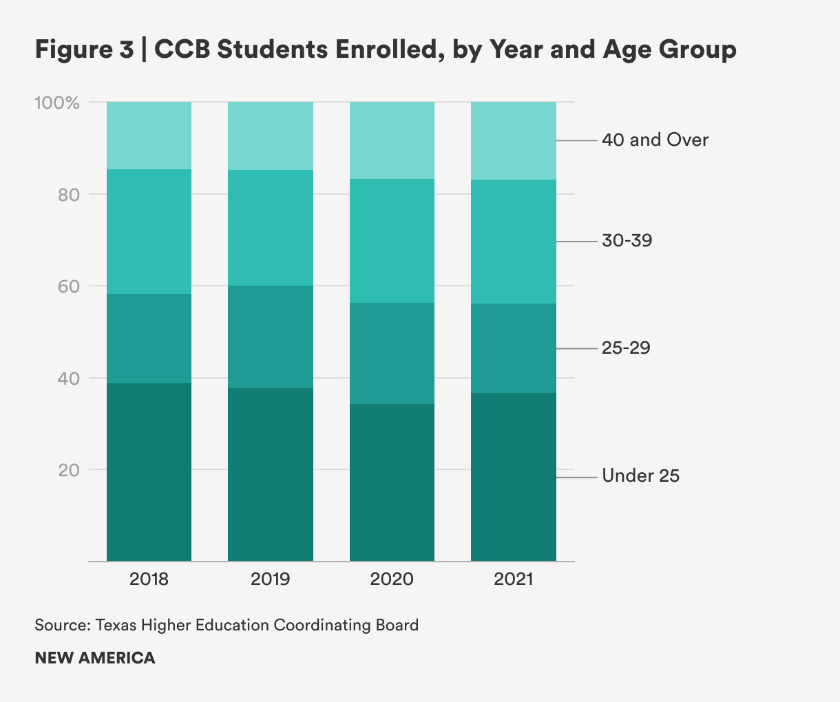 However, these age-group data make Texas stand out compared to states with a longer CCB history, such as Florida and Washington. The data from Texas show that the group with the largest enrollment were younger students (Figure 3). These programs have historically catered to older students wishing to build upon previous college credits or an associate degree after several years in the workforce. The fact that nearly 40 percent of Texas CCB students were under 25 is noteworthy and merits further exploration in future research.