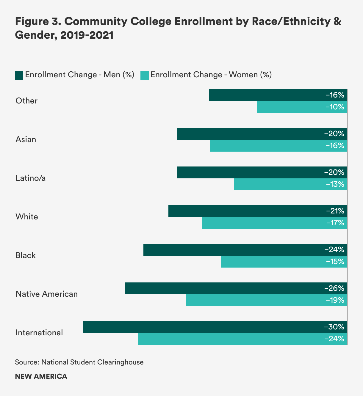 Community college enrollment declines also differ by race and gender. Enrollment declines are larger for men than women, and are particularly large for Black men, Native American men, and international students (see figure 3).