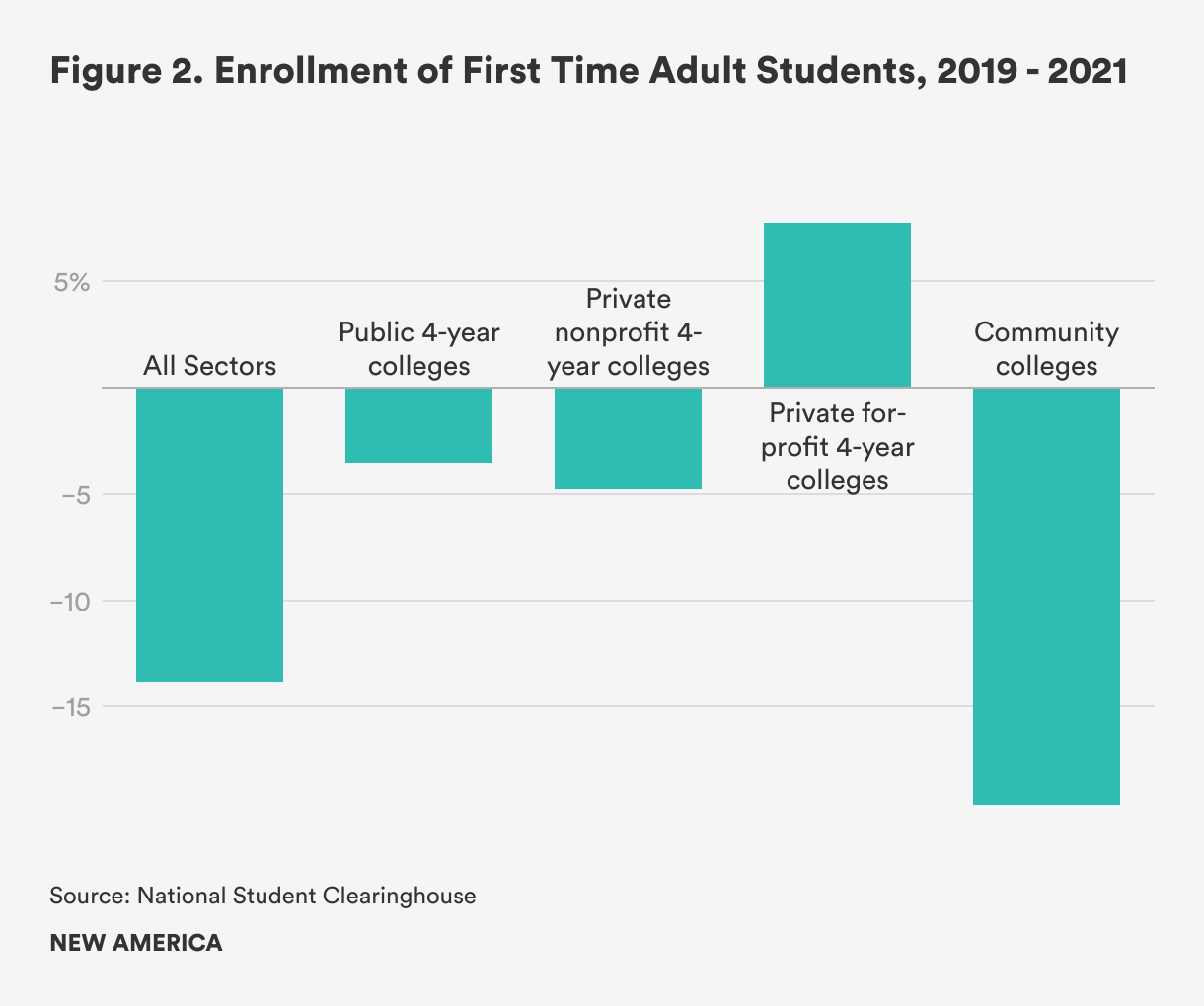 While enrollment has decreased since the start of the pandemic across all student groups, a more complicated – and troubling – trend has emerged among adult students over the age of 24. Enrollment of first-time adult college students has decreased across all higher education sectors with the exception of for-profit colleges. At these colleges, first-time adult enrollment has increased by nearly 8 percent. This stands in stark contrast to the nearly 20 percent decline of first-time adult students at community colleges (see figure 2). Given that for-profit colleges are more expensive and have worse outcomes than community colleges, and for-profit colleges specifically target Black and Latino students for recruitment, this concerning trend threatens to exacerbate educational inequity. As for-profit colleges only enroll 10 percent of U.S. college students but account for more than 50 percent of all student loan defaults, this trend could increase student debt burdens for years to come.