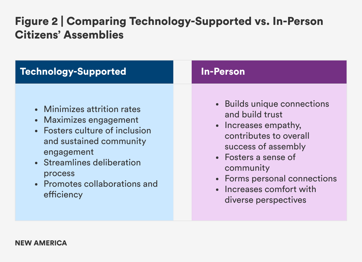 While technology improves accessibility and scalability, in-person assemblies allow participants to foster unique connections and build trust. Careful facilitation and tech support ensure full participation. This personalized approach is crucial for creating a meaningful experience for participants and fostering a sense of being heard and valued by the state government. In-person engagement allows participants to foster connection and empathy with one another, contributing to the overall success of the assembly.