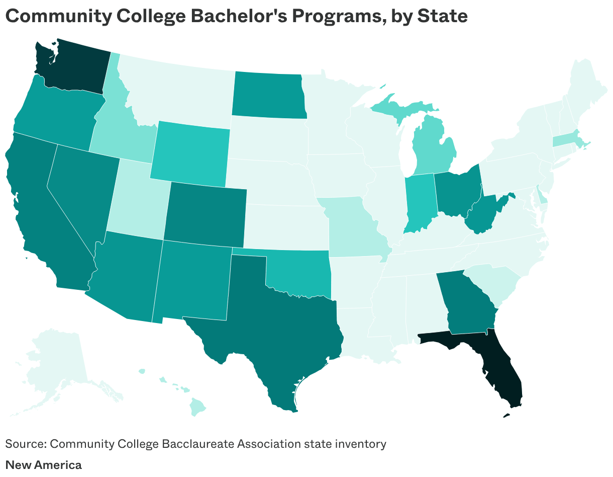 Currently, 24 states allow at least one community college to offer bachelor’s degree programs. Community colleges that have bachelor’s programs do so for a range of reasons. For example, when there is no nearby university offering a bachelor’s degree, CCBs offer geographic accessibility. While not always the case, upper-division classes in CCB programs may be less expensive than at even public universities, making a bachelor’s degree more affordable for students. And there are occupations where employers increasingly expect bachelor’s degrees, whereas in the past, only an associate degree may have been needed.