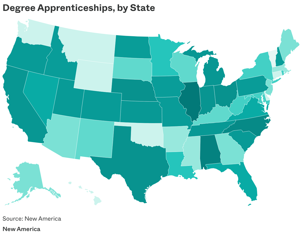 Extensive on-the-job learning with the support of a designated mentor can also help apprentices build confidence in their skills as they transition into independent work after the apprenticeship. We heard from employers in our research process that they viewed degree apprenticeships as an important leadership development strategy, a recruitment tool, and a key opportunity to ensure new employees are well-prepared and confident when they graduate and move into independent work. While these programs hold a lot of promise, a standout finding from our landscape analysis is that degree apprenticeships have taken off in a big way in some states, but not so much in others, as the map below shows.