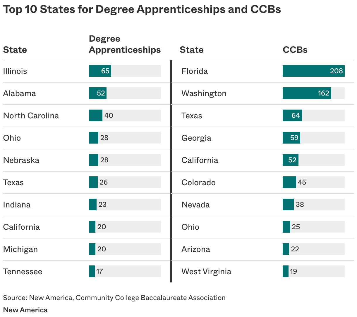 The top three states for degree apprenticeships prohibit CCB programs (Illinois, Alabama, and North Carolina). Meanwhile, three of the top five states for CCBs have fewer than 10 degree apprenticeship programs apiece (Florida, Washington, and Georgia). Texas and California may differ in many ways, but both show up in the top 10 states for these two innovative degree types. And while its population is smaller, Ohio makes an appearance on both lists as well.
