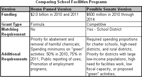 In July we analyzed funding for K-12 school facilities in the student loan reform bill, the Student Aid and Fiscal Responsibility Act, as passed by the House Education and Labor Committee. The full House passed the bill in September and preserved the $2.0 billion per year school repair program. Although the Senate has not yet acted on a similar student loan reform bill, a version drafted by the Senate Health, Labor, Education and Pensions Committee was leaked a couple of months ago. The leaked bill suggests the Senate is headed in a different direction than the House when it comes to funding school facilities construction.