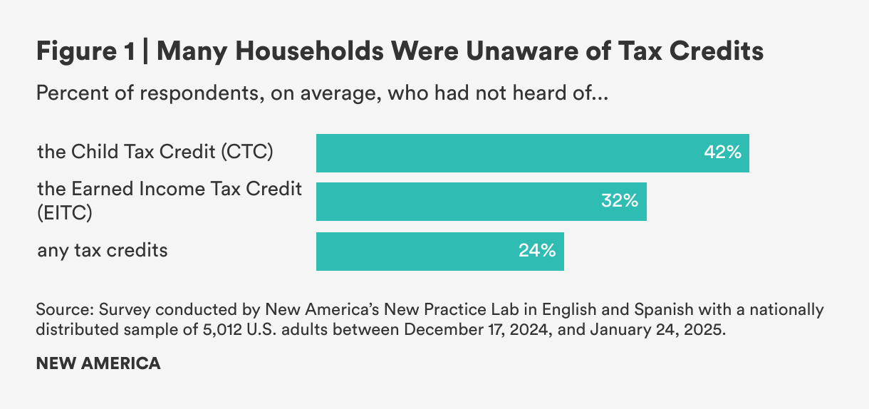When asked about their awareness of tax credits, on average, 42 percent of households had not heard of the Child Tax Credit (CTC); 32 percent had not heard of the Earned Income Tax Credit (EITC); and 24 percent had not heard of any tax credits.