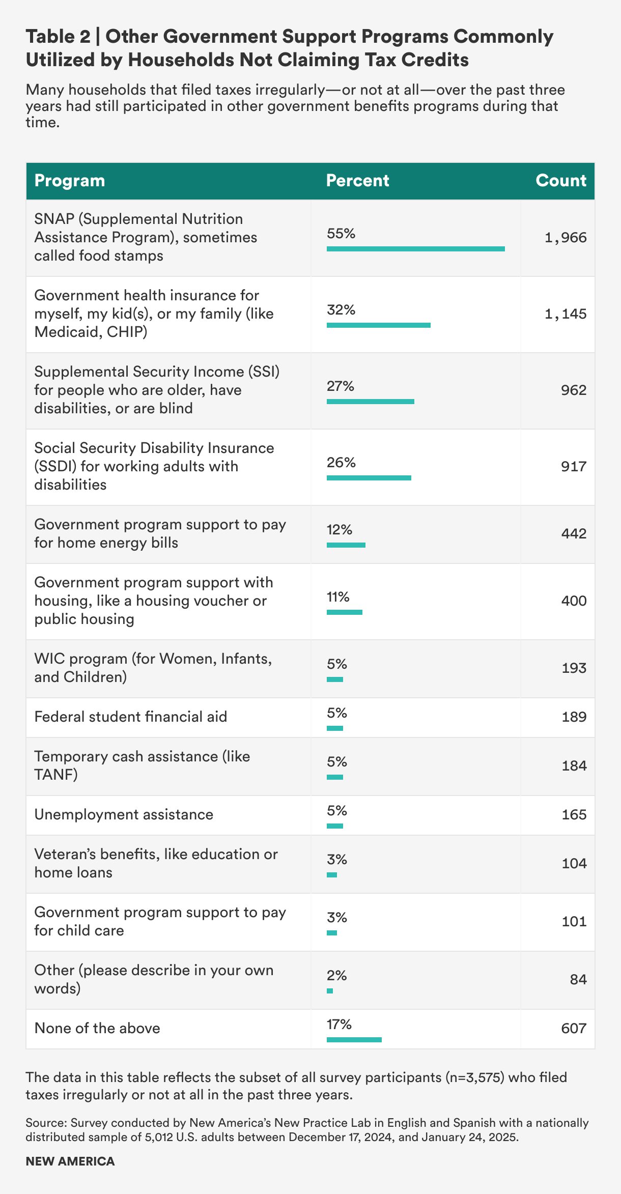 Of households who had not filed taxes at all or irregularly in the past three years, 84 percent had participated in at least one other government support program during that time period. On average, respondents (or someone in their household) had participated in 1.7 government support programs over the past two years, with participation highest among those who had not filed taxes at all (two programs on average).
