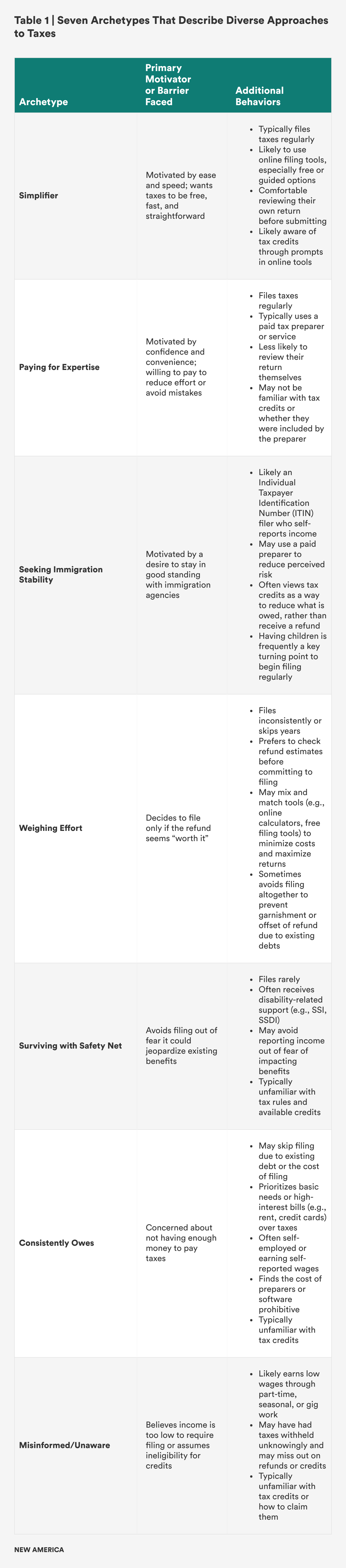 Table 1 below outlines each behavioral archetype along with their primary motivations or barriers to filing, and highlights behavioral patterns that may shape how they approach taxes and tax credits.