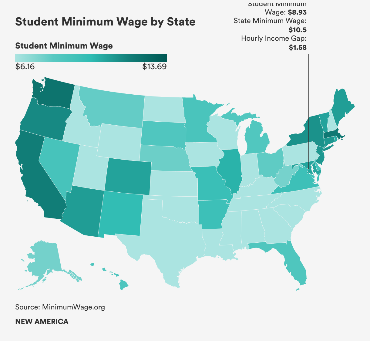 Because of the antiquated and paradoxical manner in which funding distributions are made to institutions, experts have pointed out how colleges serving more significant numbers of low-income students are disproportionately funded compared to institutions enrolling fewer low-income students. Colleges and universities are required to subsidize only 25 percent of students’ wages. In contrast, for-profit businesses and organizations must cover 50 percent and 75 percent of student wages, respectively. Despite the financial savings accrued by the more than 3,400 institutions participating in the program each year, FWS-eligible students remain poorly paid on many campuses, often below the state’s minimum (see map below for information on student minimum wage by state).