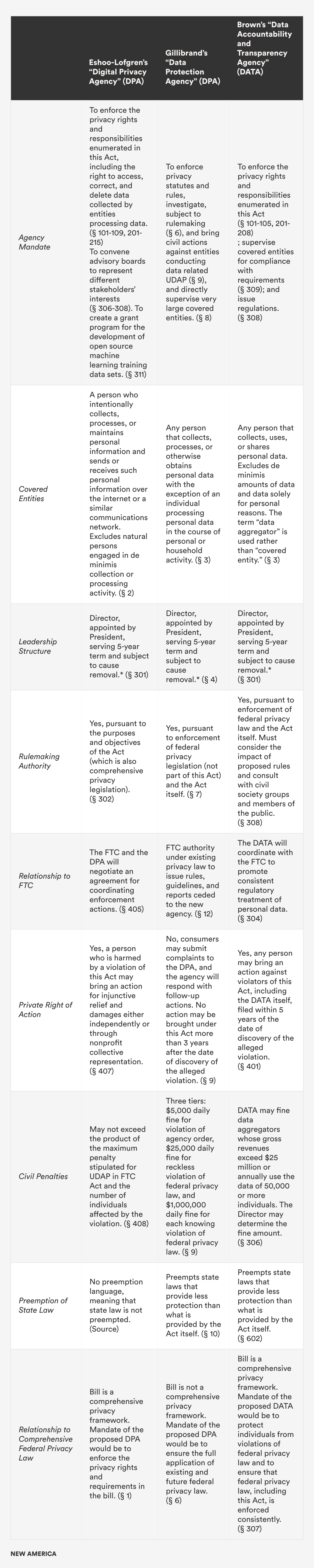 A number of lawmakers, members of civil society, and privacy experts have called for the creation of a dedicated regulatory body to enforce federal privacy law. In 2019, Representatives Anna Eshoo (D-CA) and Zoe Lofgren (D-CA) introduced the Online Privacy Act of 2019, which would create a DPA.20 In 2020, senators also introduced two additional federal privacy bills that would establish DPAs: Senator Sherrod Brown’s (D-OH) Data Accountability and Transparency Act,21 and Senator Kirsten Gillibrand’s (D-NY) Data Protection Act.22 This report will compare these three bills to one another and to FTC enforcement. We will also draw comparisons between the DPA proposals and two relatively new federal agencies: the CFPB and the Privacy and Civil Liberties Oversight Board (PCLOB). This report will not cover proposals like the Digital Platform Agency proposed by former FCC Chairman Tom Wheeler23 and Public Knowledge’s Harold Feld,24 which are sector-specific agencies that would have jurisdiction much broader than privacy.