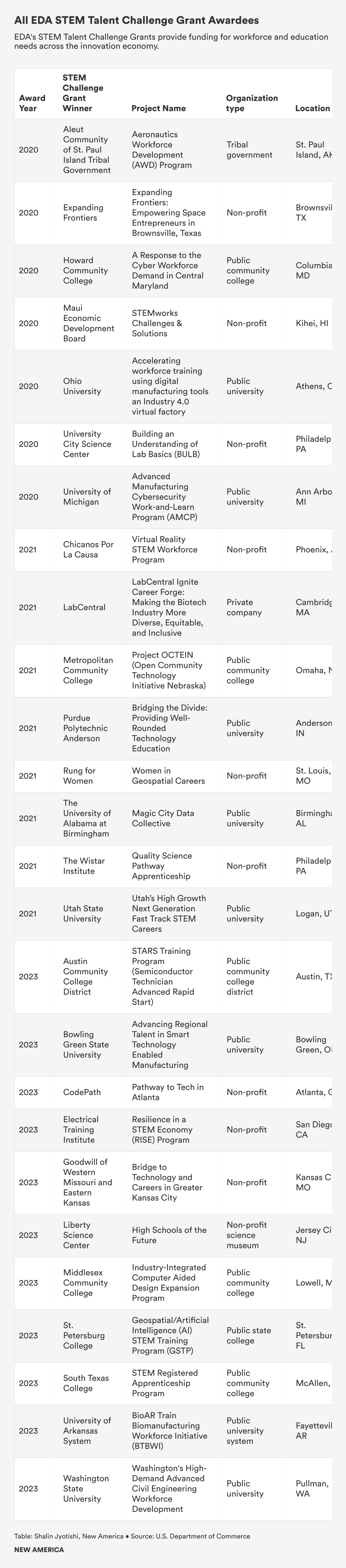 As federal agencies and regions seek to foster jobs for the future, programs like these and the institutions that are supported by them play a critical role in seeing through the successful implementation of 21st-century American industrial policy while contributing to a more equitable and accessible technology and innovation economy than we have today. Colleges interested in following the STEM Talent Challenge Grants can subscribe to the EDA newsletter here.