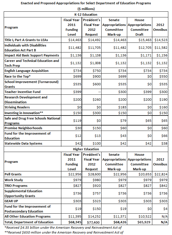 Late last night, Congress filed the conference report for the fiscal year 2012 omnibus bill which would provide appropriations funding for all federal agencies including education. The most recent version is currently available on the House Appropriations Committee’s website. Congress will vote on the bill today, as temporary fiscal year 2012 funding expires.