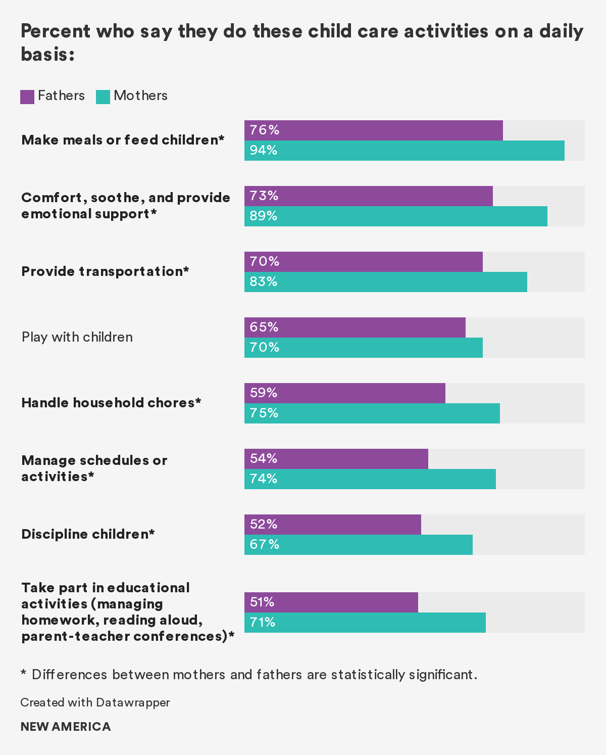 • Mothers and fathers overlap in the activities they do to take care of their children. The biggest differences are not in what they say they do but in how frequently they do it, with mothers doing more care activities on a daily basis.
