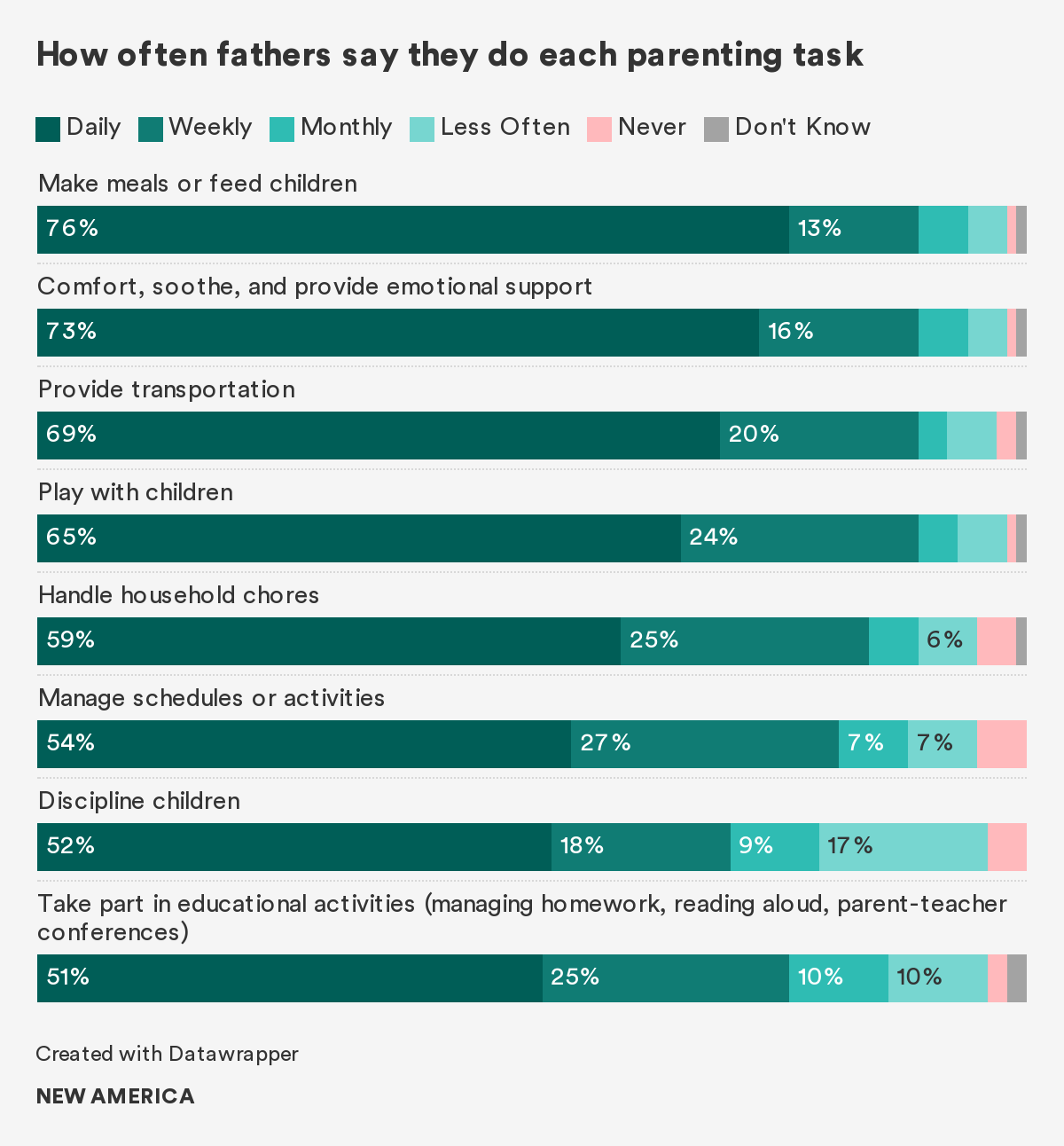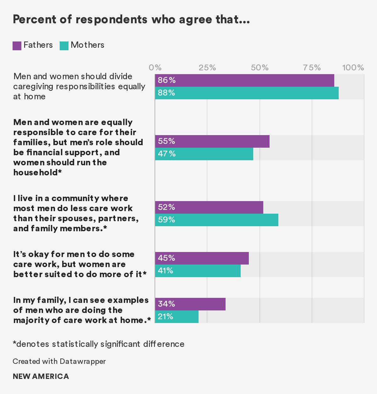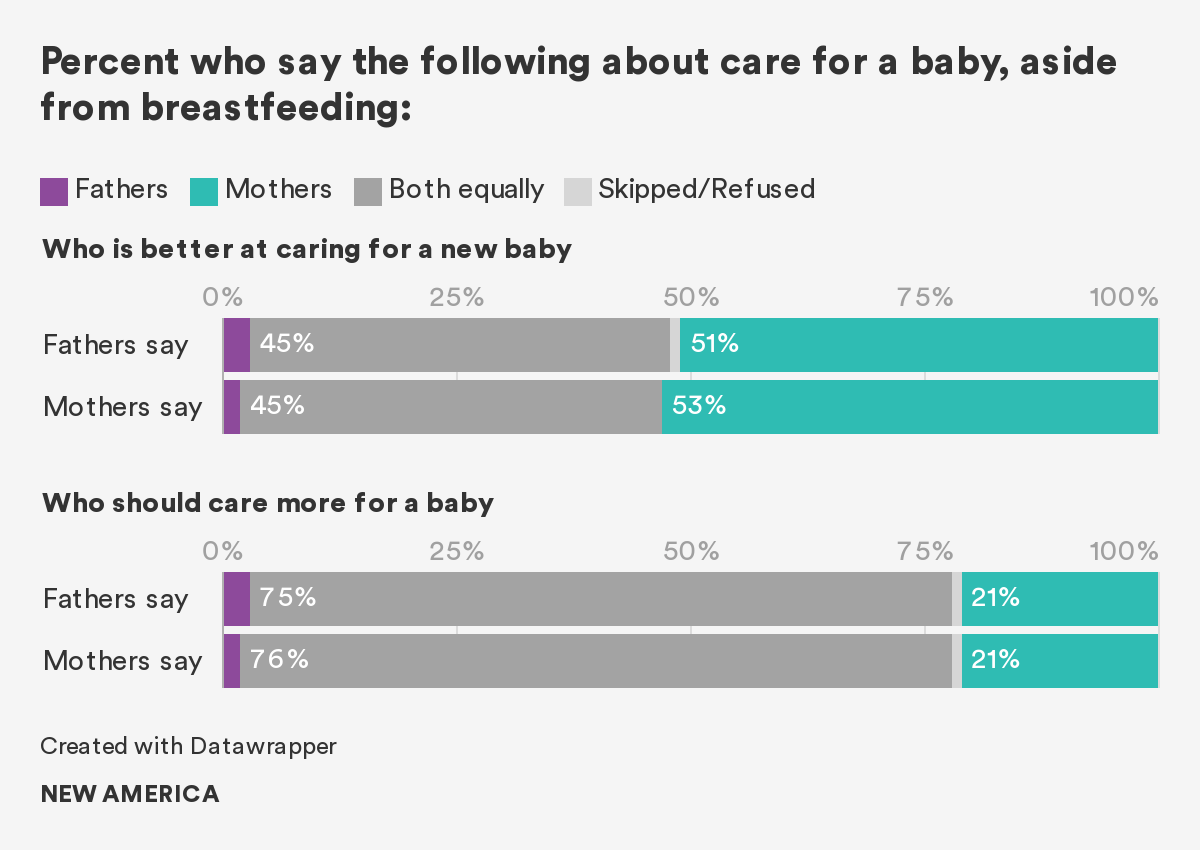 • Just under half of dads (45 percent) think moms and dads do an equally good job of caring for babies. Three-quarters (75 percent) of fathers say moms and dads should share the work of caring for babies equally, and 88 percent say men and women should share all caregiving responsibilities in the home.