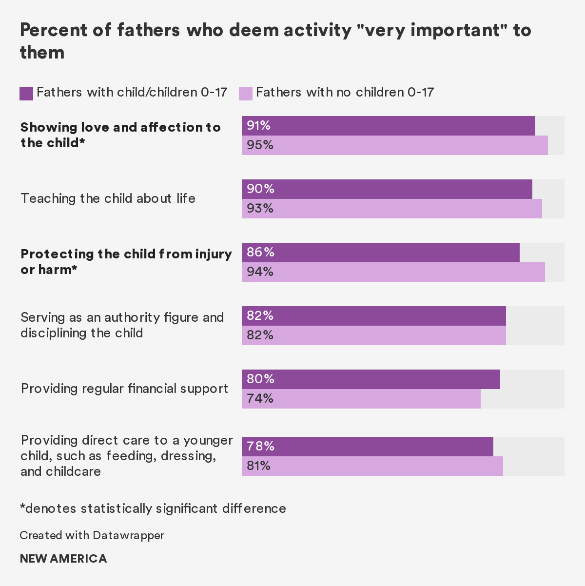 • Significantly more fathers rated “showing love and affection” and “teaching the child about life” as “very important” than the more traditional “providing financial support.”