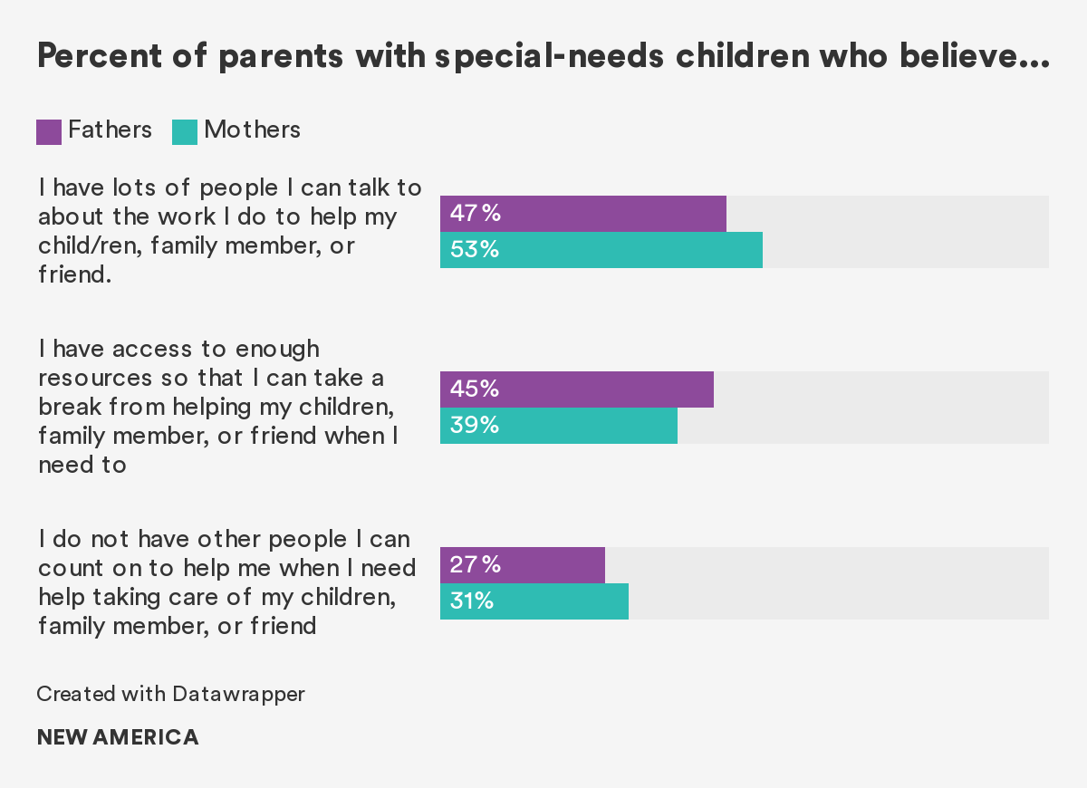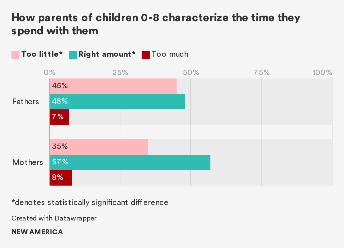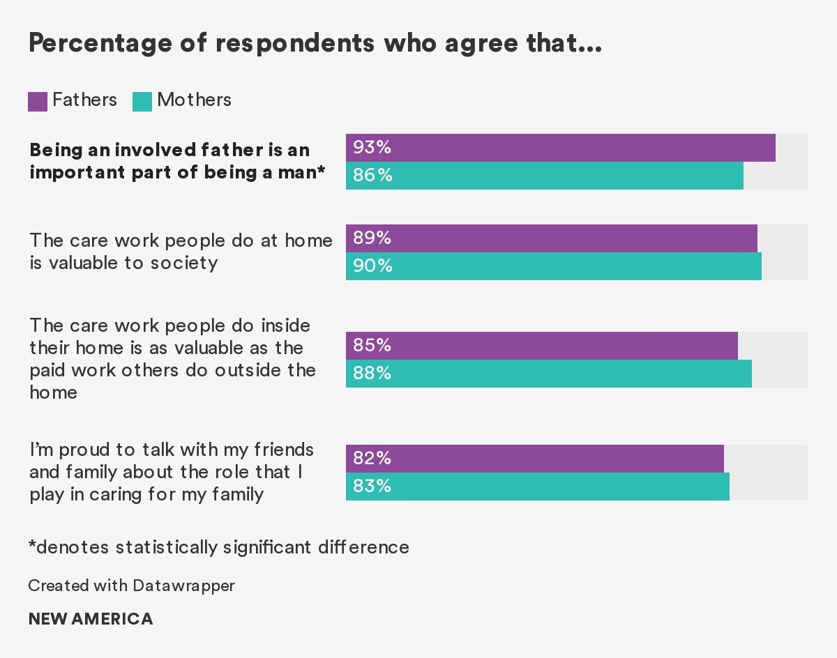 The Better Life Lab at New America engaged in a multi-method study of men and caregiving in the United States, which included questions directed at fathers and mothers. The study suggests that the past model of fatherhood as mainly about providing financially has been replaced by a new vision of fatherhood, one focused first and foremost on showing love and affection and teaching children about life. It also finds that fathers, like mothers, yearn for more quality time with their children and for more opportunities to be present and involved in their daily care. About one-third of fathers believe there are barriers preventing them from being the dads they want to be. They identify a lack of time, a lack of money, and the demands and expectations of their jobs as factors standing in the way of being the dads they want to be. While 44 percent of people in the United States still believe fathers should primarily focus on breadwinning while mothers focus on running the household, the vast majority of respondents also believe mothers and fathers should share care responsibilities equally. These contradictory findings may suggest that while some traditional notions of men’s and women’s role in child rearing persist, they do not preclude fathers from taking an active role in their children’s daily care or from expressing a desire for even more time and support in caregiving. The report concludes with actions that can be taken by policymakers, employers, and families to achieve the opportunity for equal parenting outcomes most people in the United States say they want.