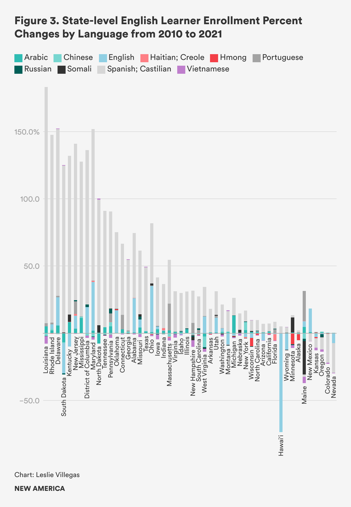 ELs come from diverse language backgrounds with over 283 languages represented nation-wide. In 2021, the top 10 languages in order of prominence were: Spanish, Arabic, English, Chinese, Vietnamese, Portuguese, Hmong, Haitian/Creole, Russian, and Somali. As shown in Figure 3, between 2010-2021, the linguistic makeup of the EL population changed significantly, with states experiencing increases and decreases in the prevalence of different languages. Indeed, no two states are the same in terms of language prevalence and diversity. (To search through and sort the data by language growth or decline, please see Table 1).