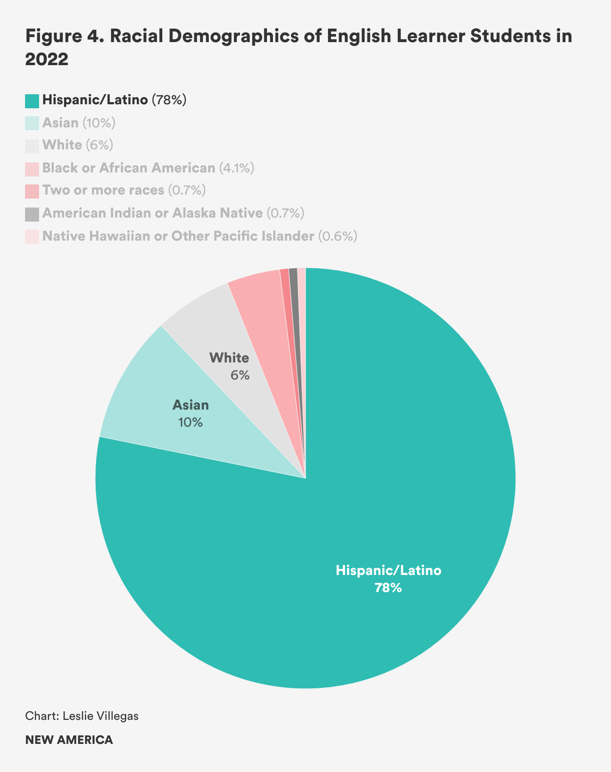 As Figure 4 shows, the majority of ELs identify as Hispanic/Latino, followed by Asian and White. It is important to note that racial demographic data included in this analysis is a product of both self-reported information as well as teacher/administrator observations. For students identified as “two or more races,” there is no further detail about what those two races are, and it is unclear how consistently this category is actually used.
