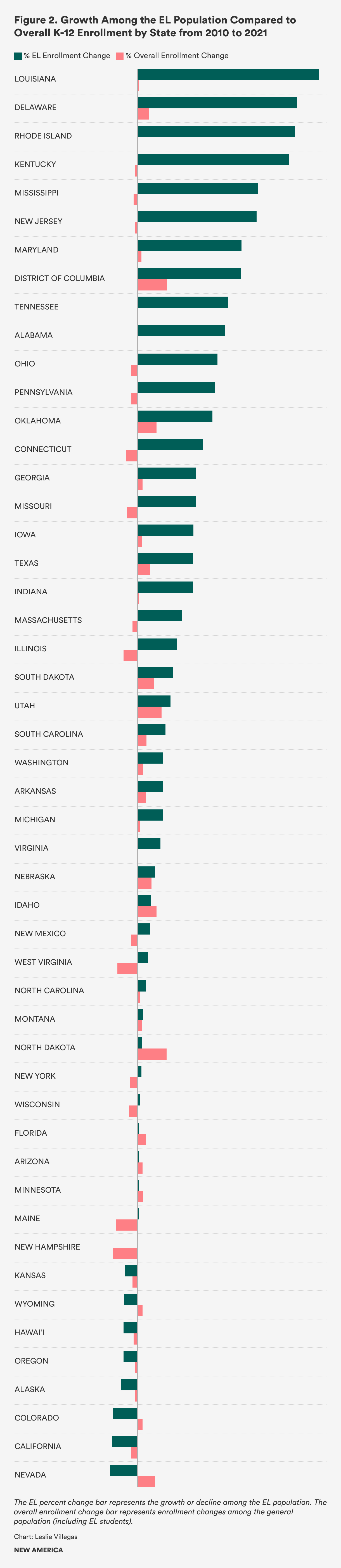 A handful of states experienced both declines in EL enrollment and overall K–12 enrollment, including Alaska, California, Hawai’i, Kansas, and Oregon. And in 17 states increases in EL enrollment were not enough to stave off overall enrollment declines.