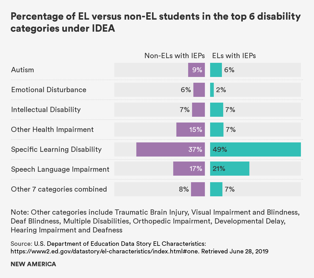 National research indicates that the categories of SLD and hearing impairment have higher proportions of students also identified as ELs, while other disability categories such as autism and emotional disability have lower proportions of students who are also identified as ELs.45 According to the U.S. Department of Education, "Among ELs with disabilities, nearly 50 percent had a specific learning disability, compared to nearly 38 percent of students with disabilities who are not ELs. Similarly, 21 percent of ELs with a disability, compared to 17 percent of non-ELs with a disability, were identified as having a speech or language impairment."46