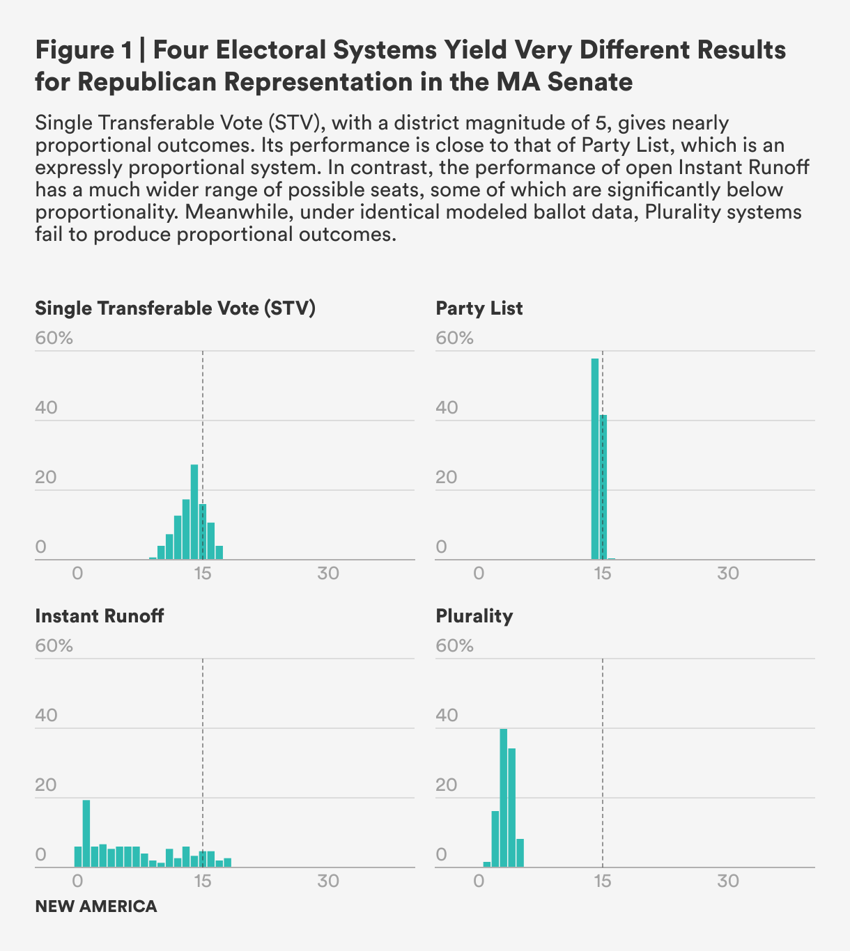 This brief summarizes a report from the Data and Democracy Lab (formerly the Metric Geometry and Gerrymandering Group), commissioned by New America and led by Professor Moon Duchin. The report presents results of computational simulations of Massachusetts state legislature elections held under different electoral systems: (1) plurality; (2) instant run-off (also known as ranked-choice voting); (3) the single-transferable vote (STV, or proportional ranked-choice voting); and (4) list-based proportional systems. The simulations use ranking models designed to mimic realistic voter behavior and apply them across a large number of plausible electoral maps.