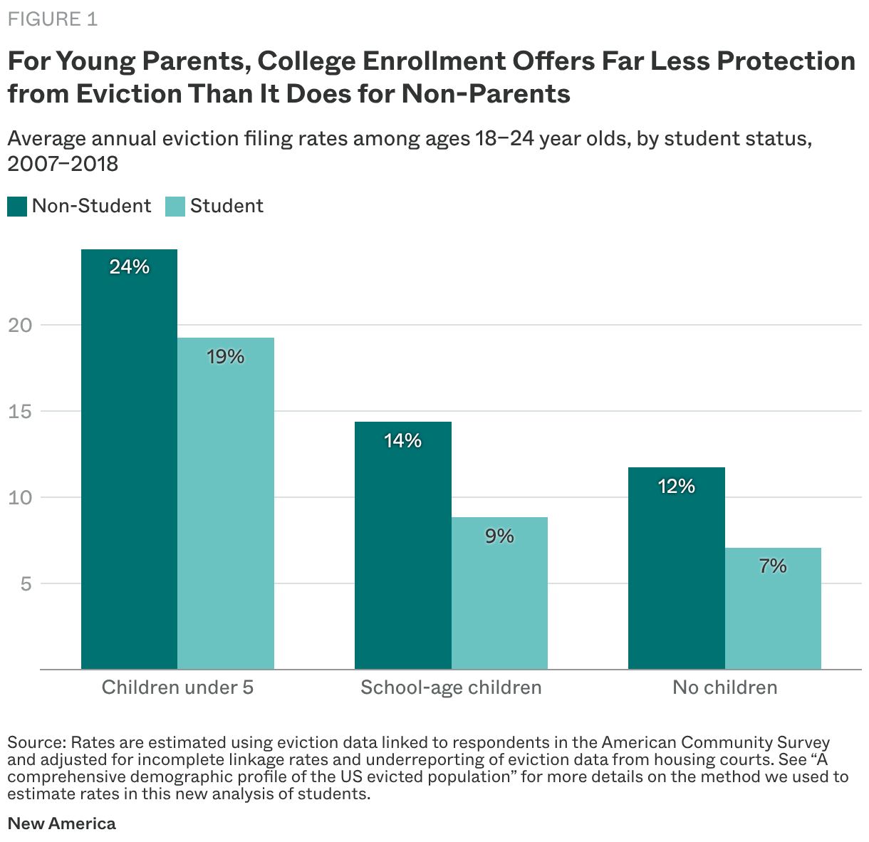 This two-part series uses linked data from the American Community Survey to estimate nationally representative eviction filing rates by student and parenting status. This first piece focuses on younger parenting students aged 18-24 with young children under 5 and finds that enrollment offers far less protection against eviction than we expected.