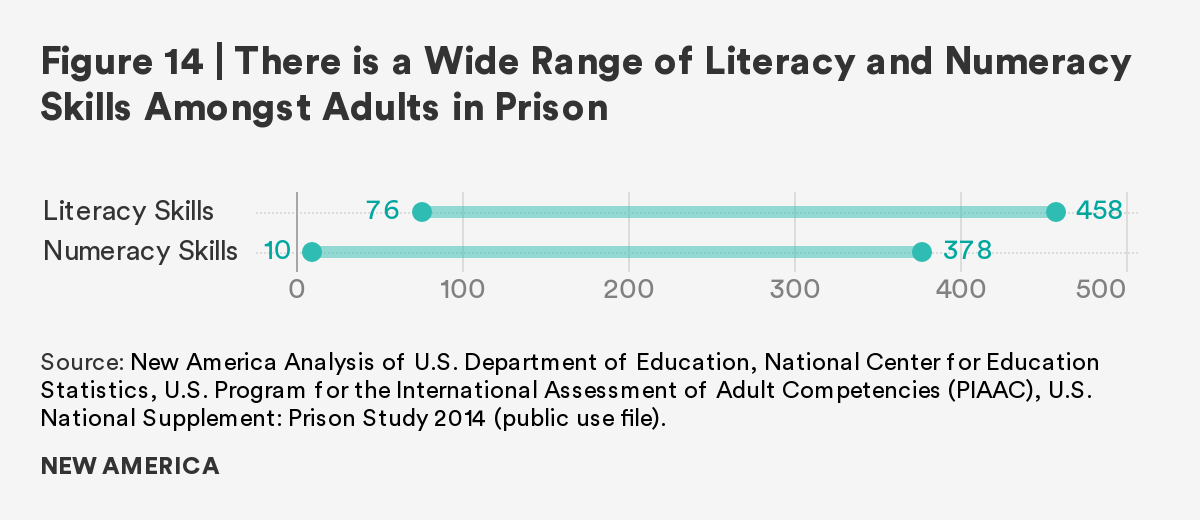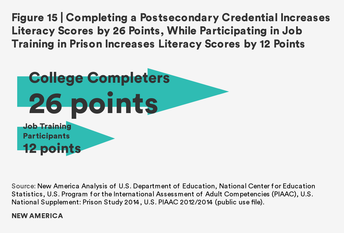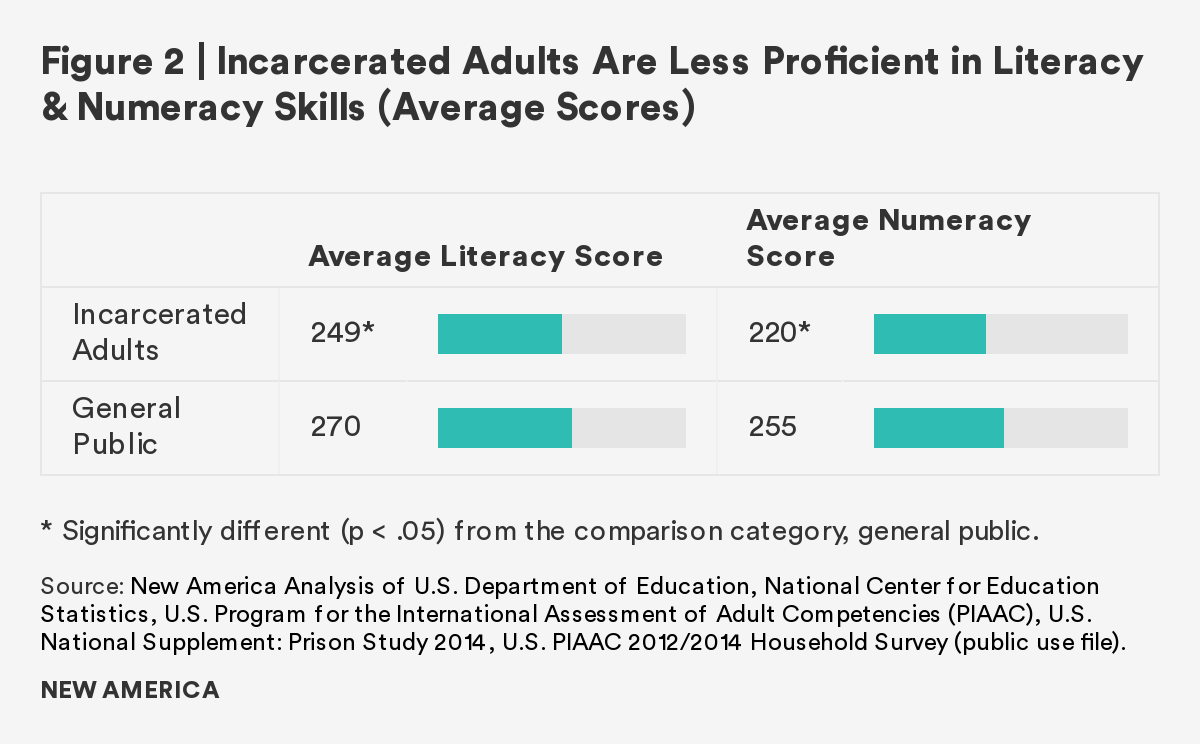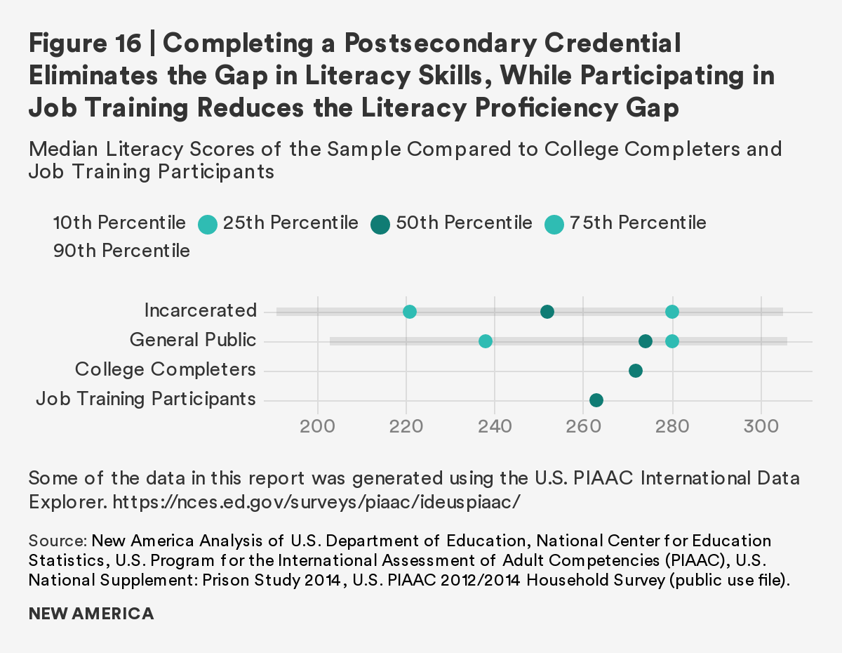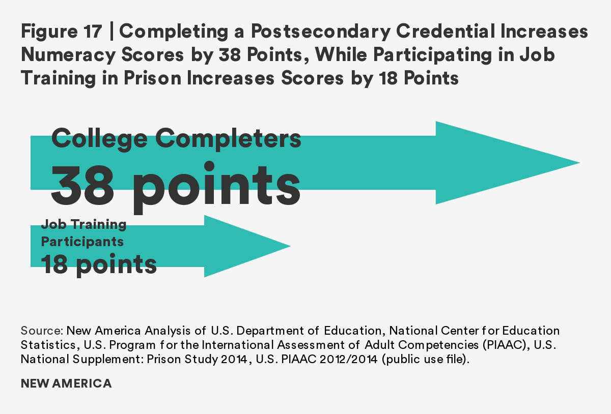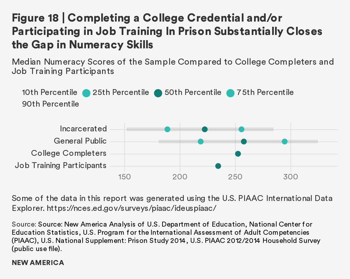 As the overwhelming majority of those in U.S. prisons will rejoin society, it is imperative to prepare individuals to transition with effective rehabilitative programs. This report finds that although there is a gap between incarcerated adults and the general public in both literacy and numeracy skills, completion of a postsecondary credential and participation in job training ameliorates the gap. Those who participate in and/or complete these correctional programs have comparable literacy and numeracy scores to the general public. Furthermore, regardless of time to reentry, all incarcerated adults show interest in, participate in, and complete these programs at similar rates.