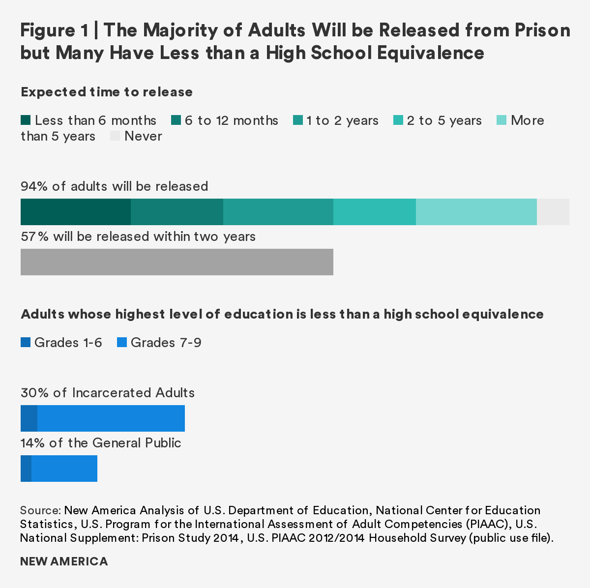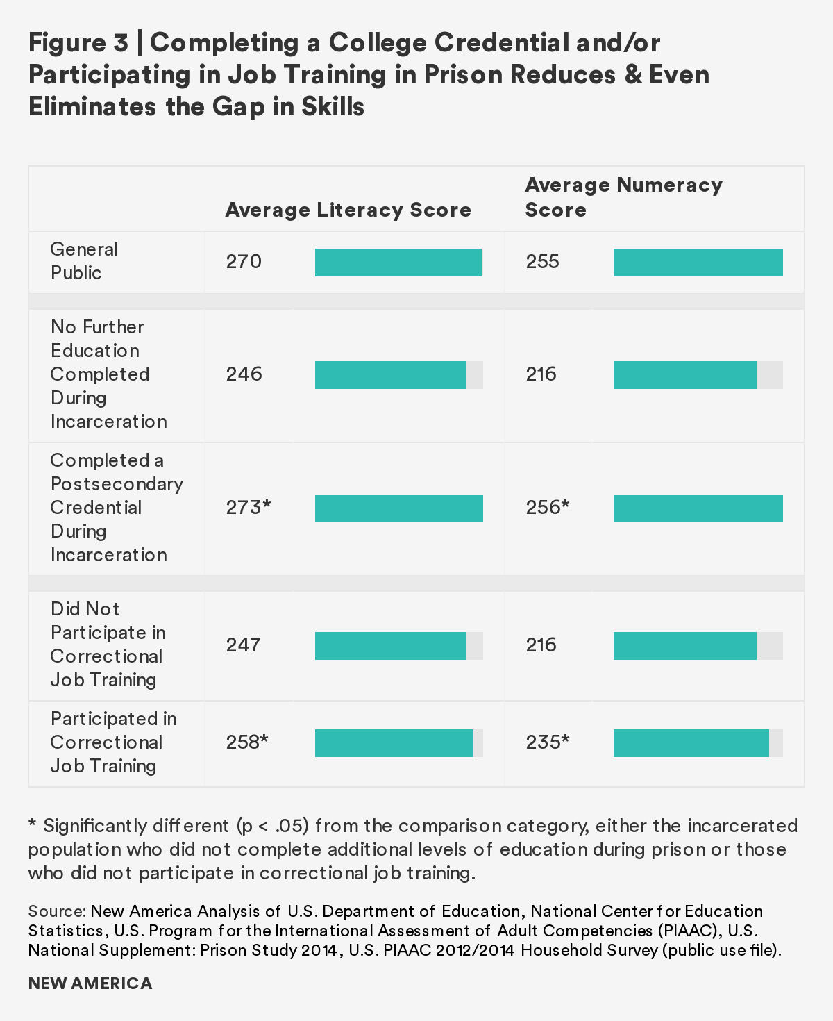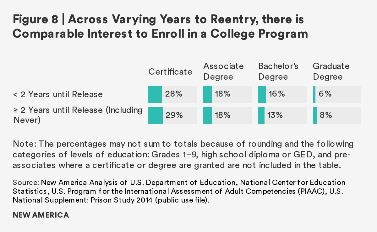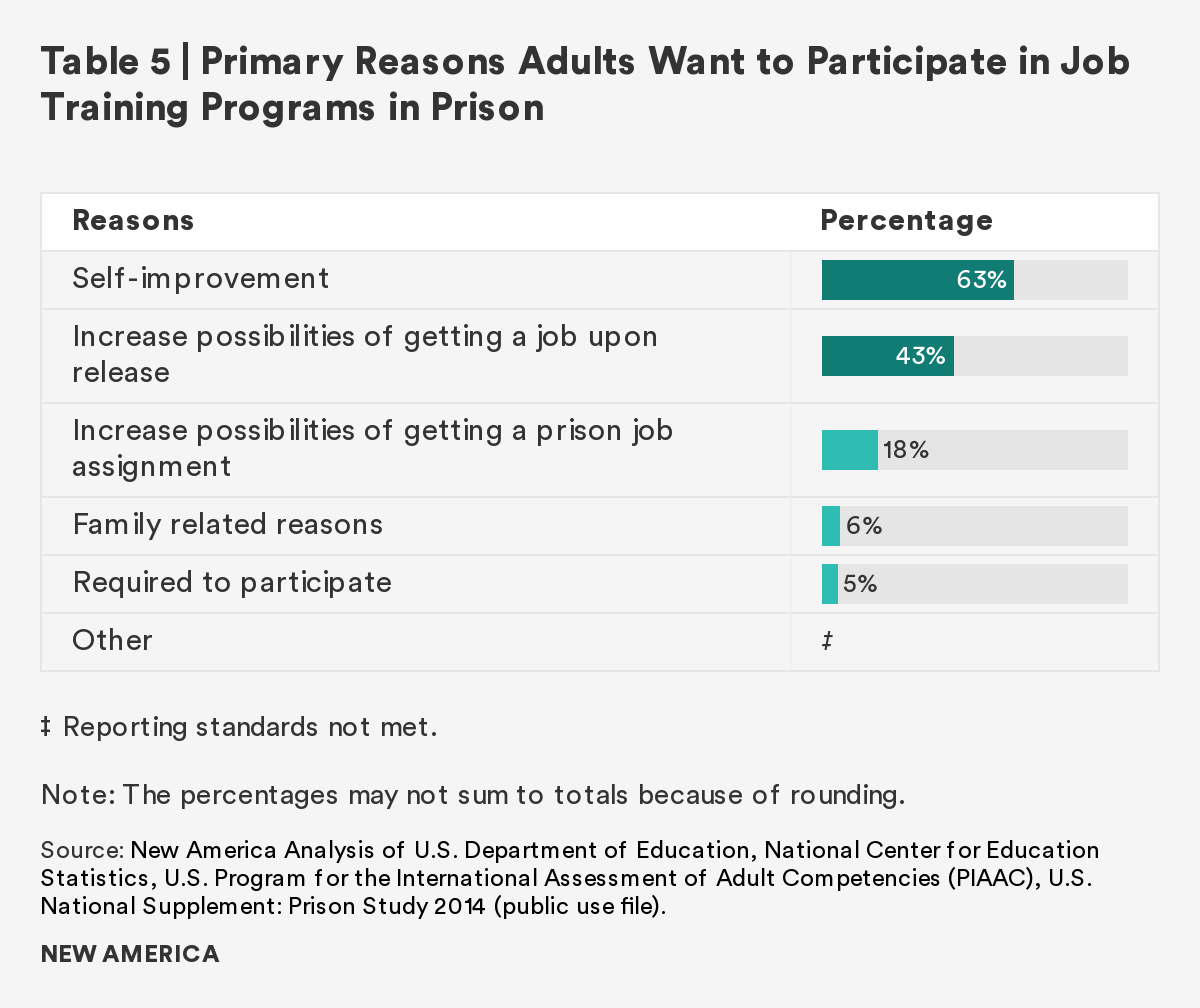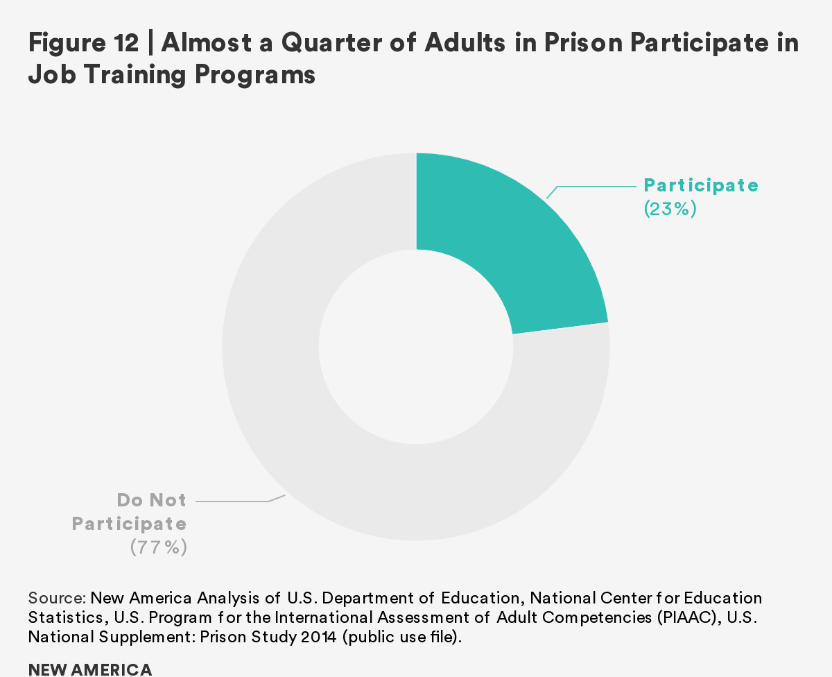 As the overwhelming majority of those in U.S. prisons will rejoin society, it is imperative to prepare individuals to transition with effective rehabilitative programs. This report finds that although there is a gap between incarcerated adults and the general public in both literacy and numeracy skills, completion of a postsecondary credential and participation in job training ameliorates the gap. Those who participate in and/or complete these correctional programs have comparable literacy and numeracy scores to the general public. Furthermore, regardless of time to reentry, all incarcerated adults show interest in, participate in, and complete these programs at similar rates.