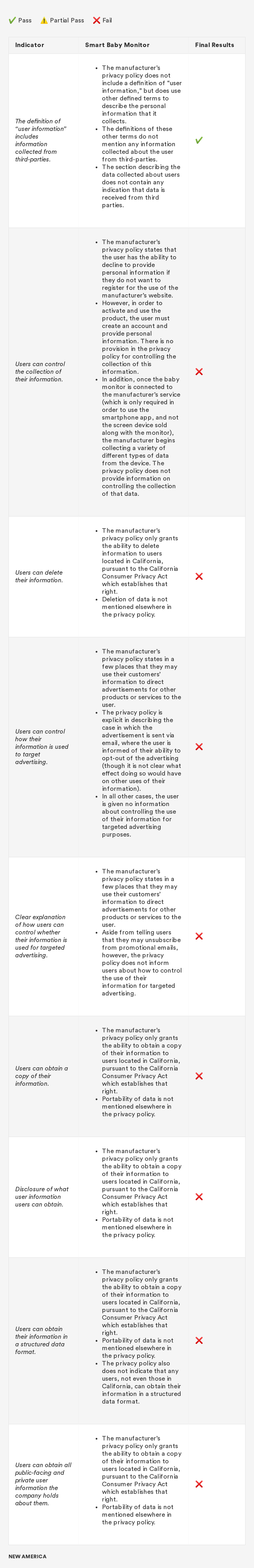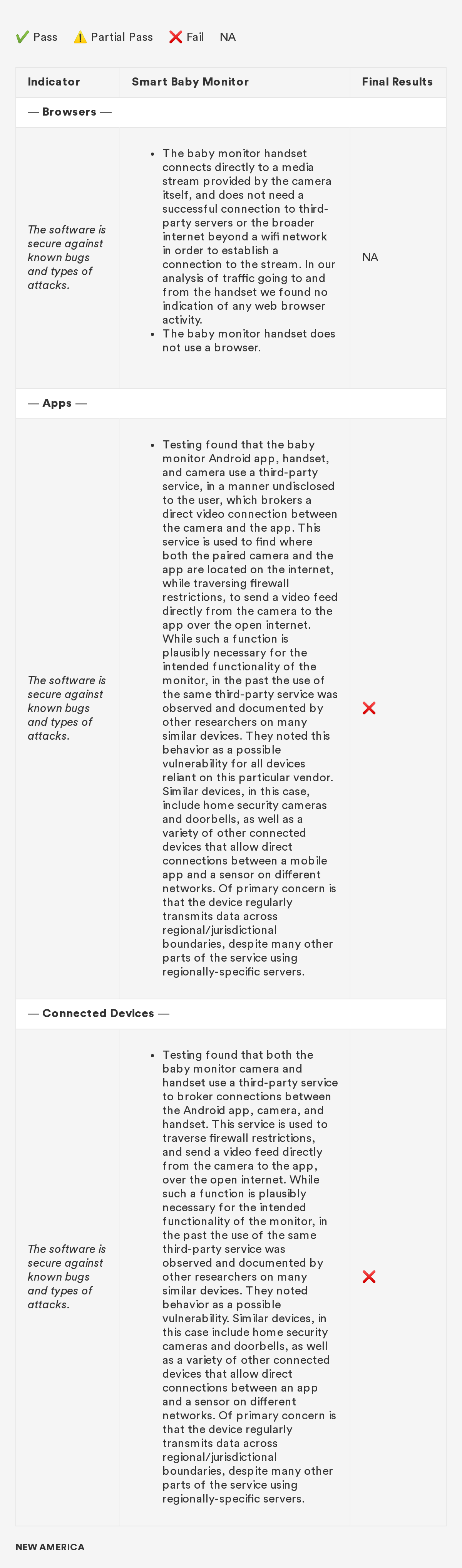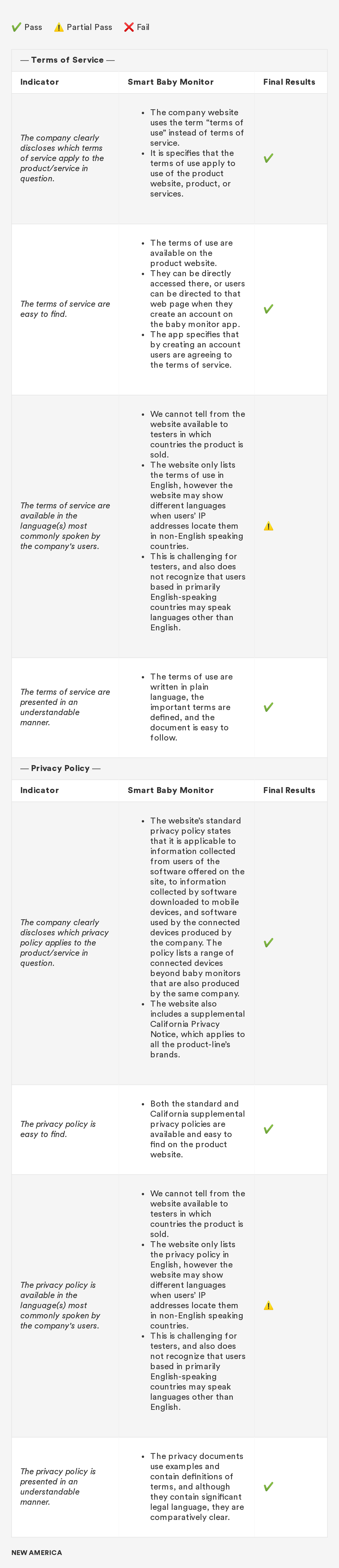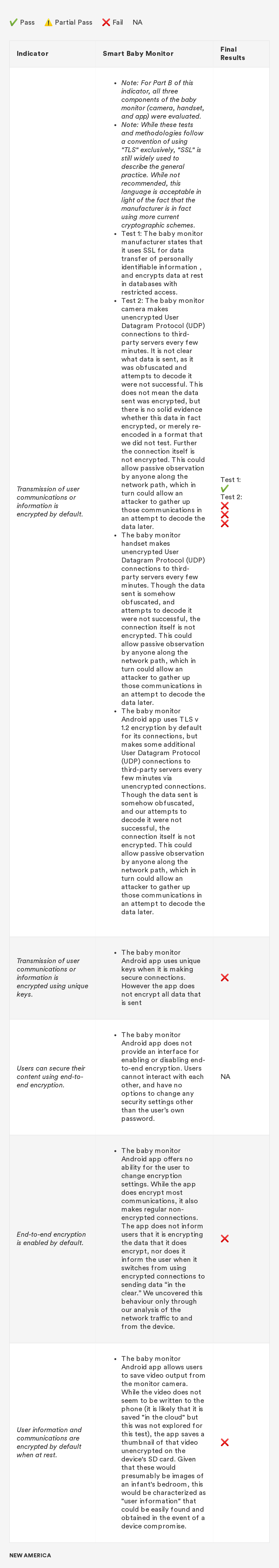 In 2018, New America’s Open Technology Institute (OTI) launched a project to educate people about the Digital Standard,⁠ a new framework for evaluating the privacy and security of internet-connected consumer products and software. The Standard was developed by a group of organizations, including Ranking Digital Rights, in collaboration with Consumer Reports. Building off this work, we're selecting a few representative products and apps and putting them through the tests that the Digital Standard describes. Our methodology will include exactly how we judged each indicator, including what information was needed in order to measure whether the indicator was met, where we looked for it and where we found it, and how we interpreted the inevitable vagueness and edge cases. Below you'll find information related to the third product in this series: a smart baby monitor.