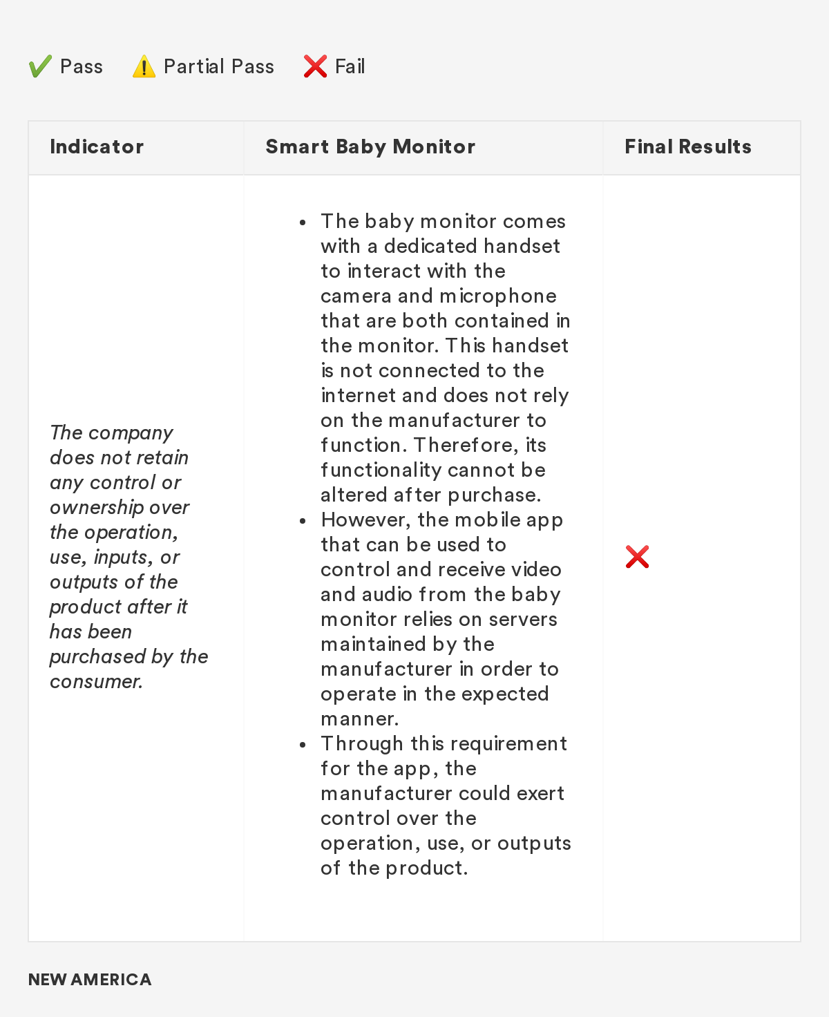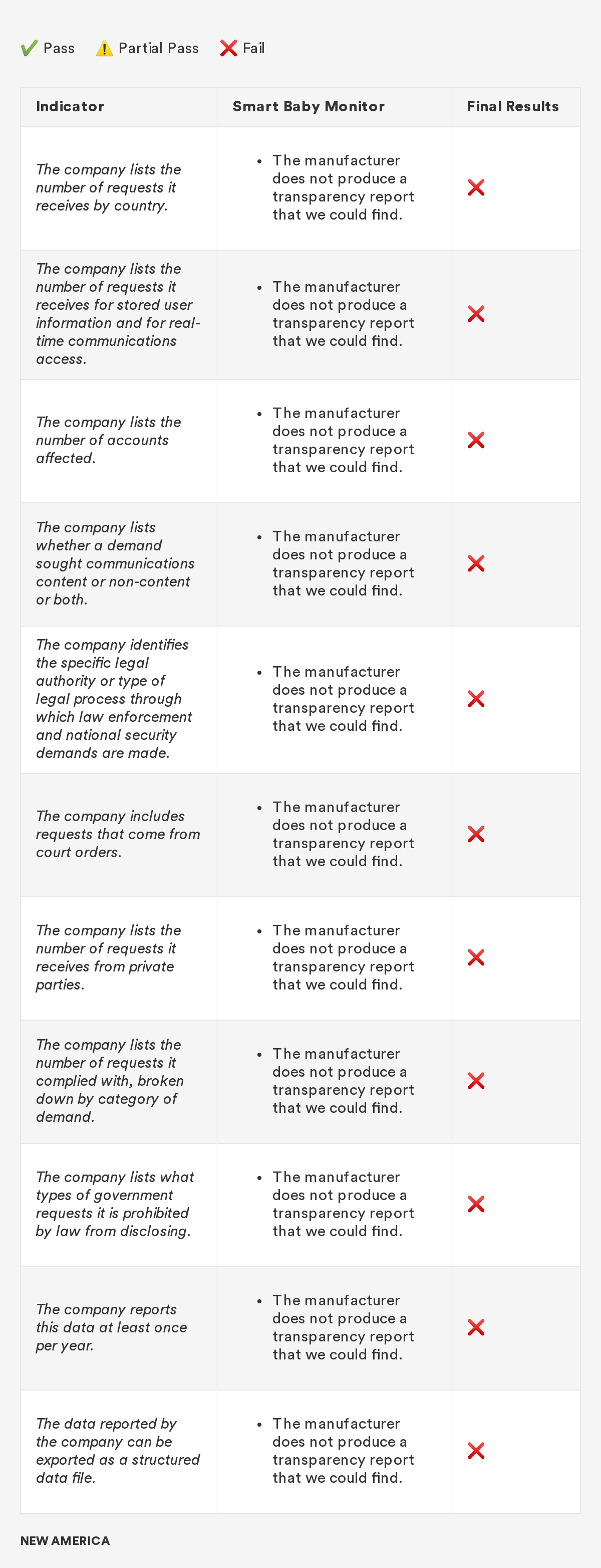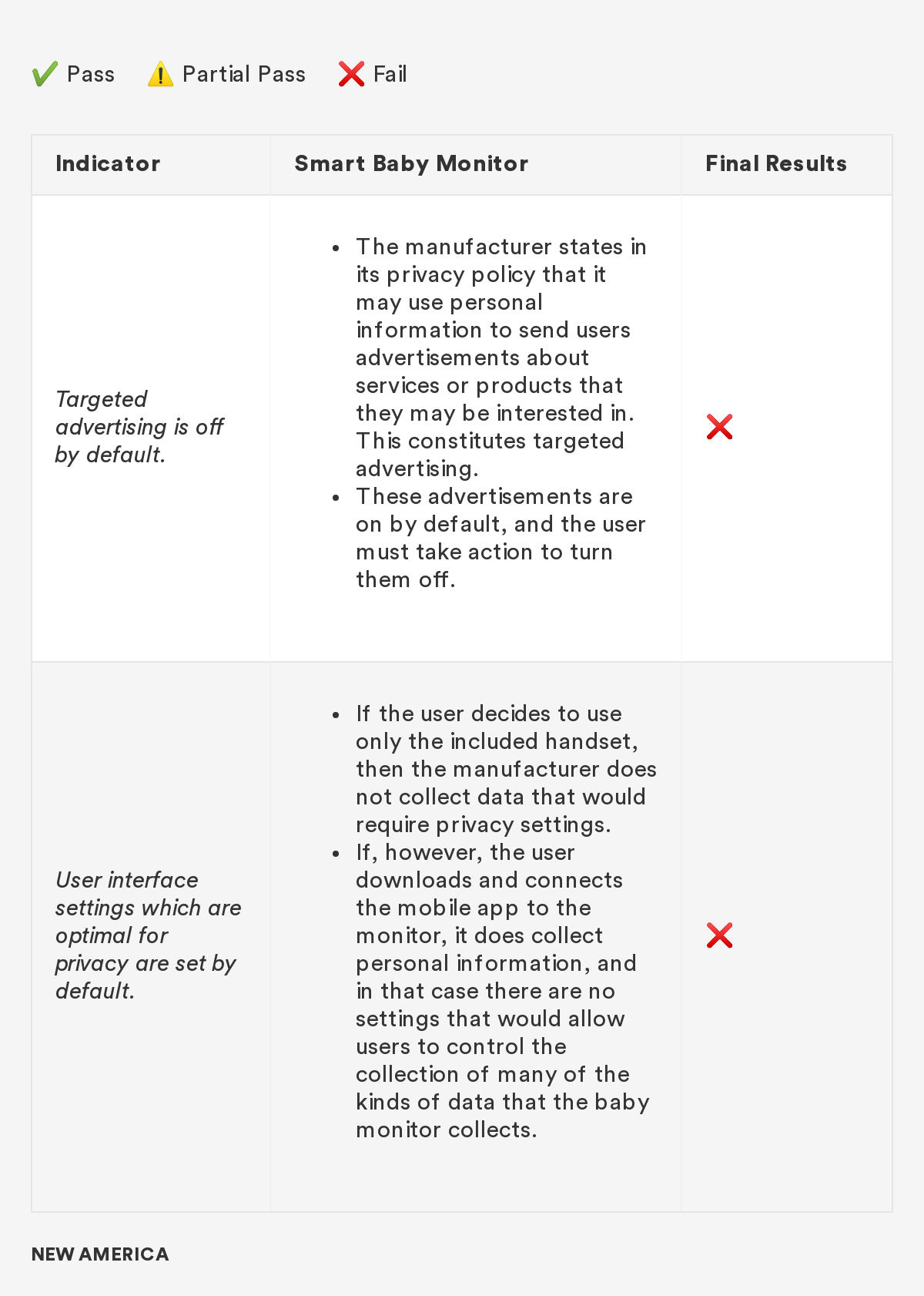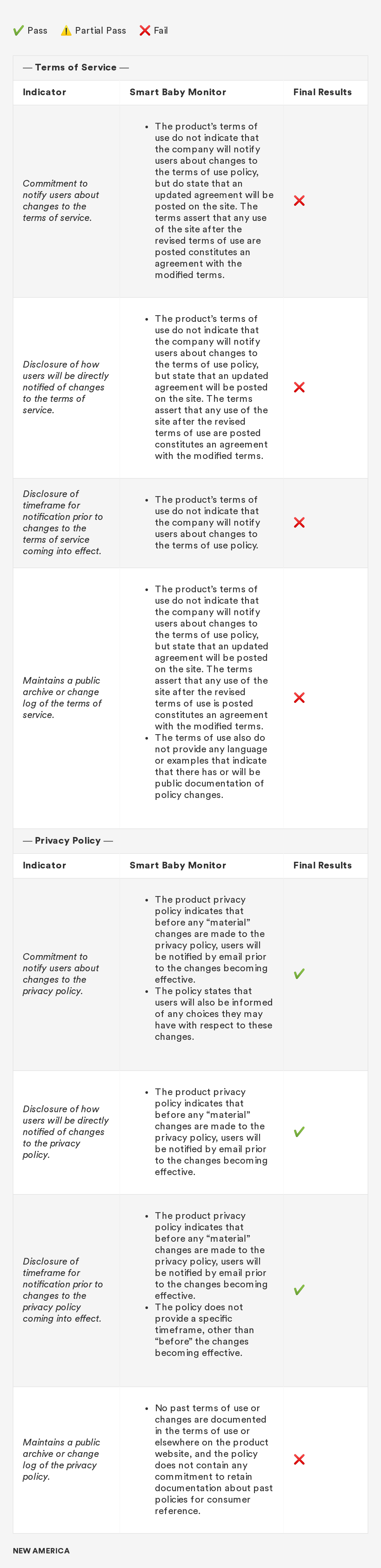 In 2018, New America’s Open Technology Institute (OTI) launched a project to educate people about the Digital Standard,⁠ a new framework for evaluating the privacy and security of internet-connected consumer products and software. The Standard was developed by a group of organizations, including Ranking Digital Rights, in collaboration with Consumer Reports. Building off this work, we're selecting a few representative products and apps and putting them through the tests that the Digital Standard describes. Our methodology will include exactly how we judged each indicator, including what information was needed in order to measure whether the indicator was met, where we looked for it and where we found it, and how we interpreted the inevitable vagueness and edge cases. Below you'll find information related to the third product in this series: a smart baby monitor.