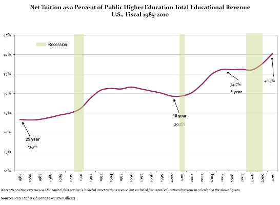 Recent trends suggest that the fiscal constraints under which states operate may lead to even tighter budgets for state colleges and universities as state legislatures often look to higher education budgets for savings. Lingenfelter presented evidence showing that over the past 25 years the state share of costs for public higher education have dropped significantly, leaving students to shoulder the burden through increased tuition and fees. According to SHEEO’s fiscal year 2012 State Higher Education Finance report, state support for higher education will drop by an additional 7.6 percent from fiscal year 2011, compounded by the absence of ARRA funds to help plug the gap. Should student enrollment continue to grow, states will be forced to make difficult decisions about raising tuition further and cutting per-student state funding.