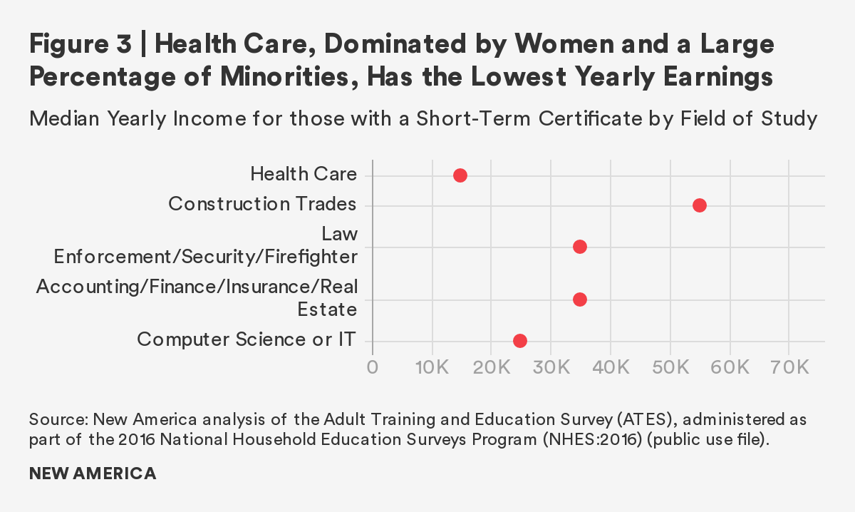 In addition, we found that adults with a short-term certificate in health care have the lowest rates of employment compared to the other four fields of study.26 Not only does a certificate of fewer than 15 weeks in health care yield very low pay, students are also at a higher risk for job instability. Stability is a benefit that many students who enroll in these programs are looking for.