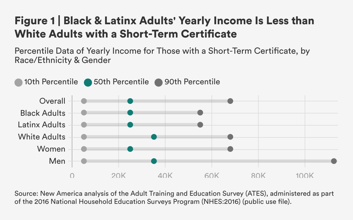 The earnings disparity for short-term certificates (15 weeks or fewer) is noticeably adverse for students of color and women. Figure 2 shows that, among those with a short-term certificate, the median yearly income is less for minority students than for white students. The median yearly income for Black and Latino/Latina adults with a short-term certificate is $10,000 to $20,000 less than the median yearly income of their white counterparts who hold a credential of similar length.