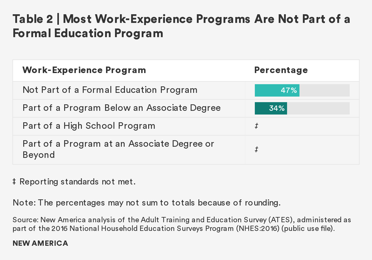 Contributing to the low participation rate in work-experience programs is the reality that most of these opportunities are not affiliated with an education program. Table 2 shows that about one-third of work-experience programs are associated with a sub-baccalaureate program, with most being separate from an educational course of study. That means students are responsible for identifying and pursuing their own opportunities to learn outside the classroom.