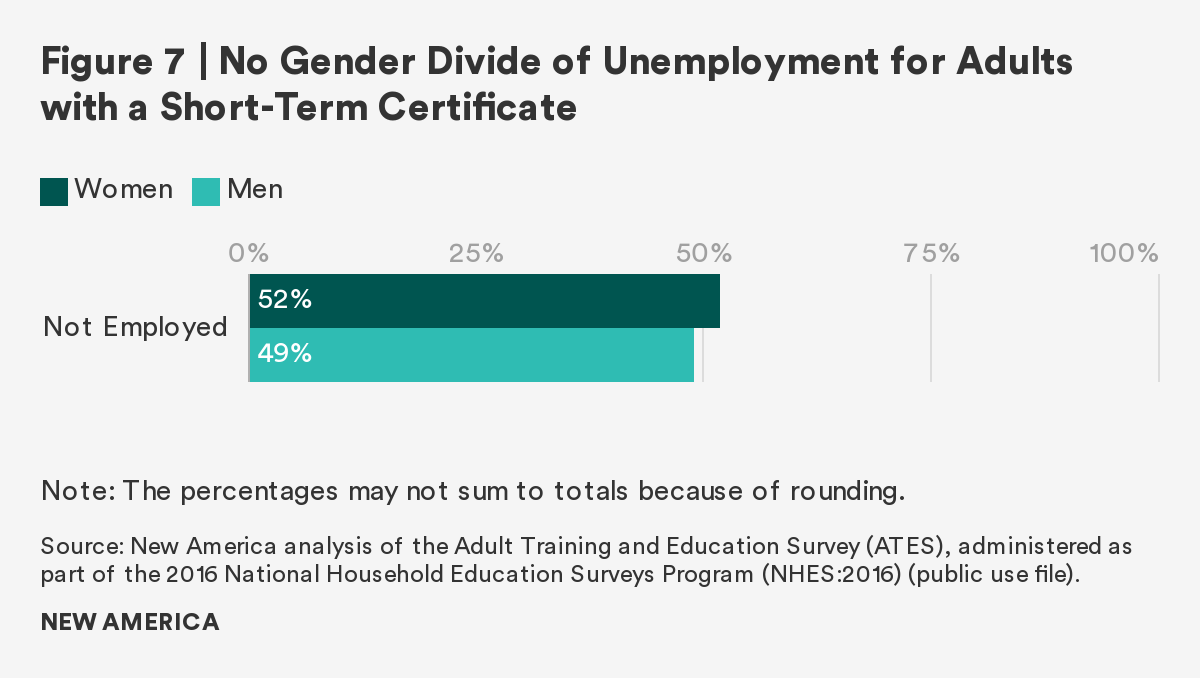 For adults with only a short-term certificate, as Figure 6 shows, roughly 40 percent say they are not employed. Of those who are not employed, there is neither a race/ethnicity nor a gender divide.30 The percentage of Black adults with a short-term certificate who are not employed is comparable to the percentage of unemployed white adults with a similar credential. Figure 7 shows that, similarly, the percentage of unemployed women and unemployed men is not significantly different. Regardless of race/ethnicity and gender, two in five adults with only a short-term certificate are not employed.