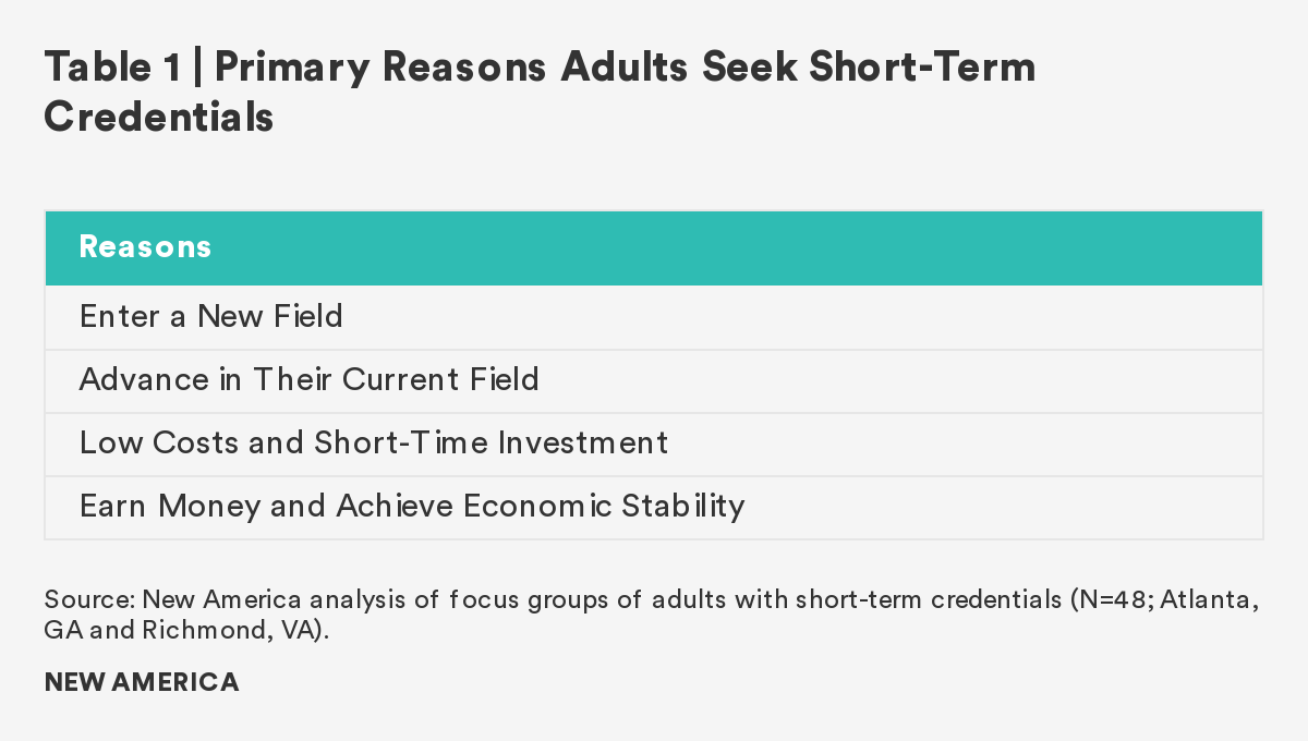 - Lake Research Partners conducted focus groups of 48 adults with short-term credentials on behalf of New America, February–May 2020 (Atlanta, GA and Richmond, VA).