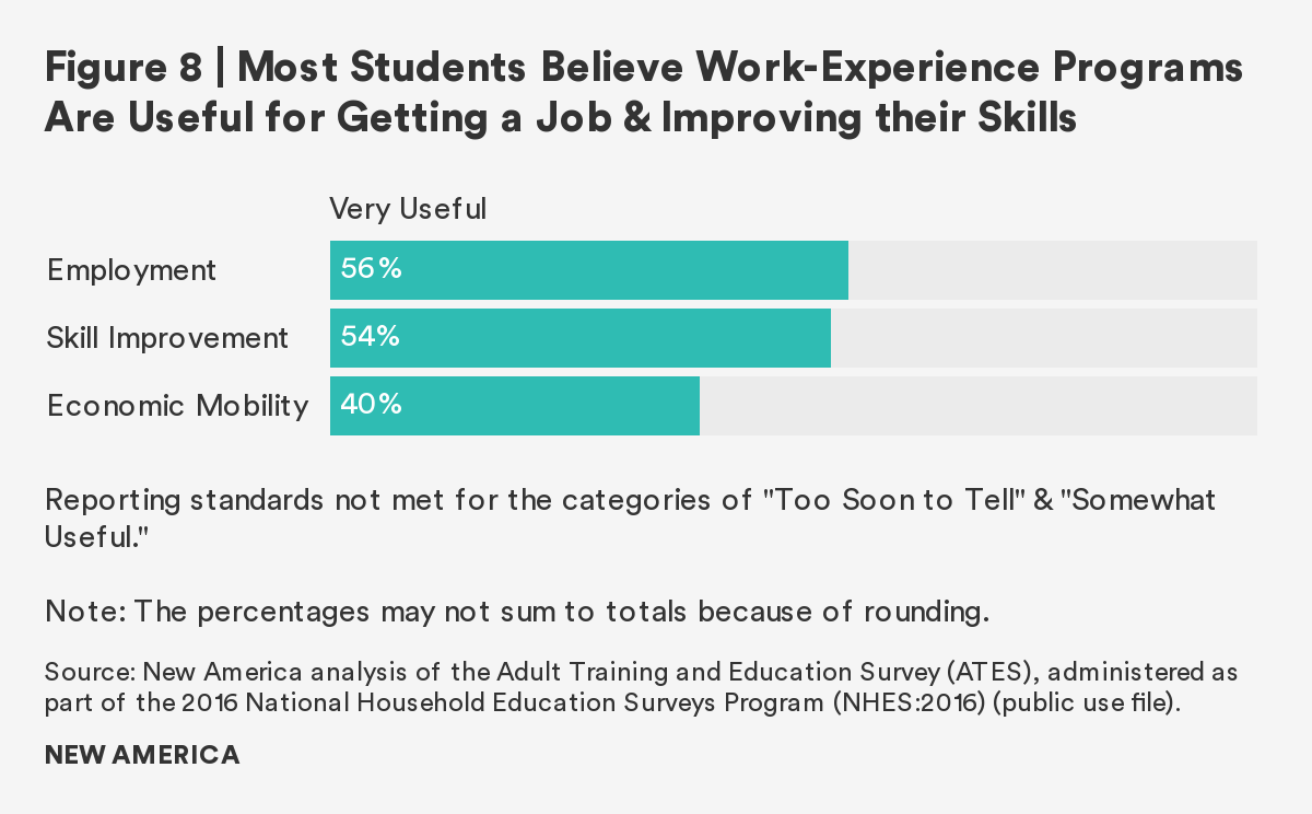 Although the majority of adult students who participate in work-experience programs31 (such as internships or apprenticeships) believe these hands-on experiences are very useful for getting a job and improving their skills, as shown in Figure 8, only one in five adults with a short-term certificate has the opportunity to participate in such experiences, as shown in Figure 9.