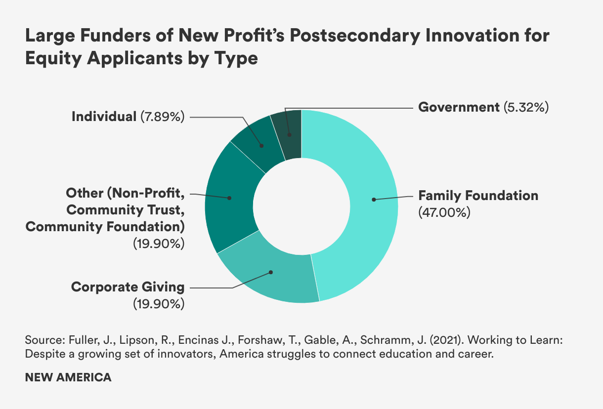 The Harvard research underscores that the business model for workforce development remains challenging. Organizations outside the community college sector are heavily subsidized by philanthropy. The median organization in New Profit’s applicant pool expected 60 percent of their annual revenue to come from philanthropy, and one-quarter expected philanthropy to cover over 90 percent of their revenue. These non-profits and social enterprises also appeared to struggle to access public funding sources, posing questions about sustainability and scaling capacity. However, their financing stands in stark contrast to traditional community college funding models, which may underutilize philanthropic funding. Notwithstanding MacKenzie Scott’s recent and unprecedented $429 million investment in 20+ community colleges, two-year institutions have traditionally relied on state funding, student tuition, and struggled to draw attention from large donors. However, the paper shows that employment-focused programs appear to be attractive destinations for philanthropic capital, especially for family and corporate foundations. Community college leaders may look to these sources as they look to fund and expand workforce programs. Included below is a breakdown of large funders that community college leaders could explore.